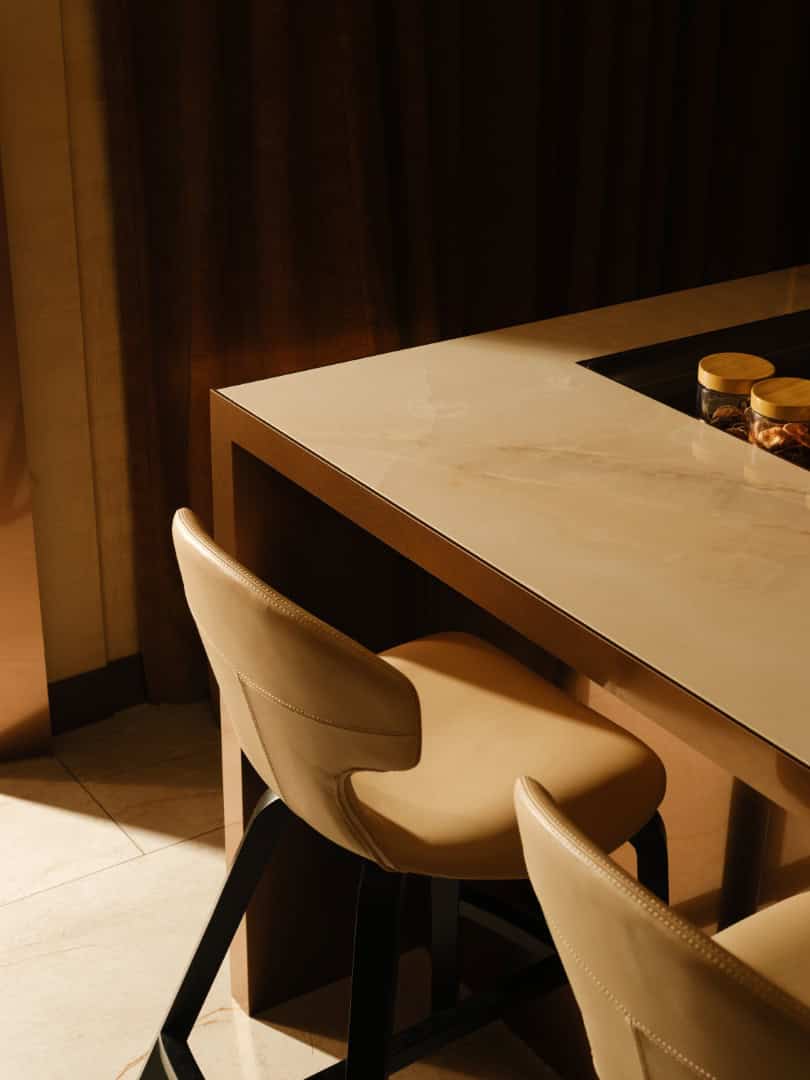 As interior designer Evgeniya Lazareva explains: “The interior design is conceived as a backdrop for the show kitchen. All elements harmoniously blend with each other, forming a balanced composition, much like the dishes from chef Christophe Lerouy.”