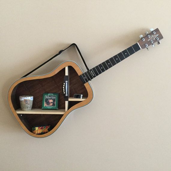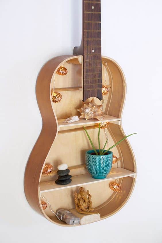 The process should start with opening the guitar and you will attach a board in the middle that will serve as a shelf where you can put some items. You can put more shelves, depending on your wishes. After that, you can re-paint it, or leave it in its original finish. Then attach it to the wall and your guitar shelf is ready. On your new shelf, you can put whatever you want. See some interesting guitar shelf designs that will attract your attention for sure! Have fun and be productive!