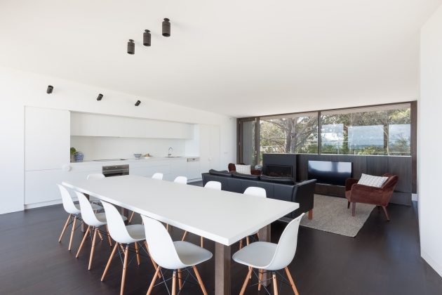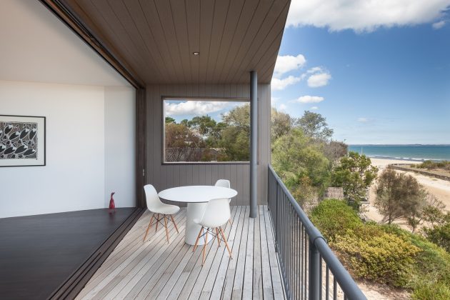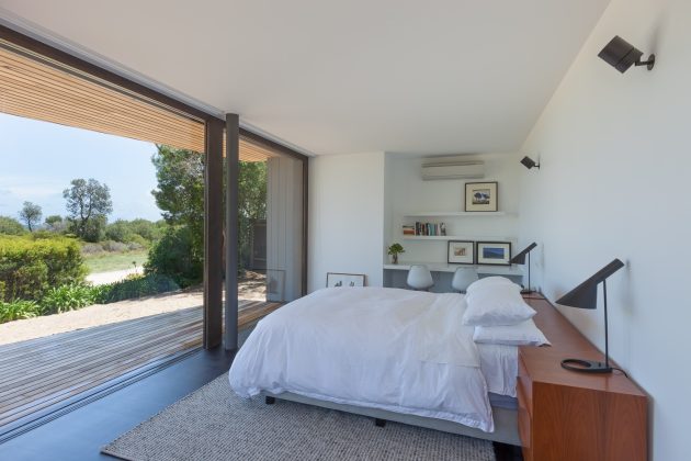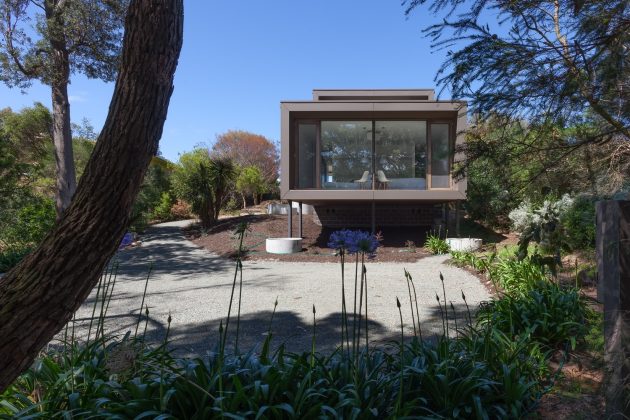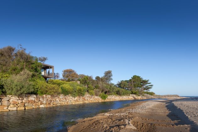 Residence J&C by Open Studio Pty Ltd is a semi-permanent residence for a couple, their dog and occasional visitors in Somers, Australia, located virtually on the beach and offering panoramic views across Western Port Bay. The majority of the site remains untouched, maintaining a continuous and informal landscape stretching from the street to the creek’s embankment.