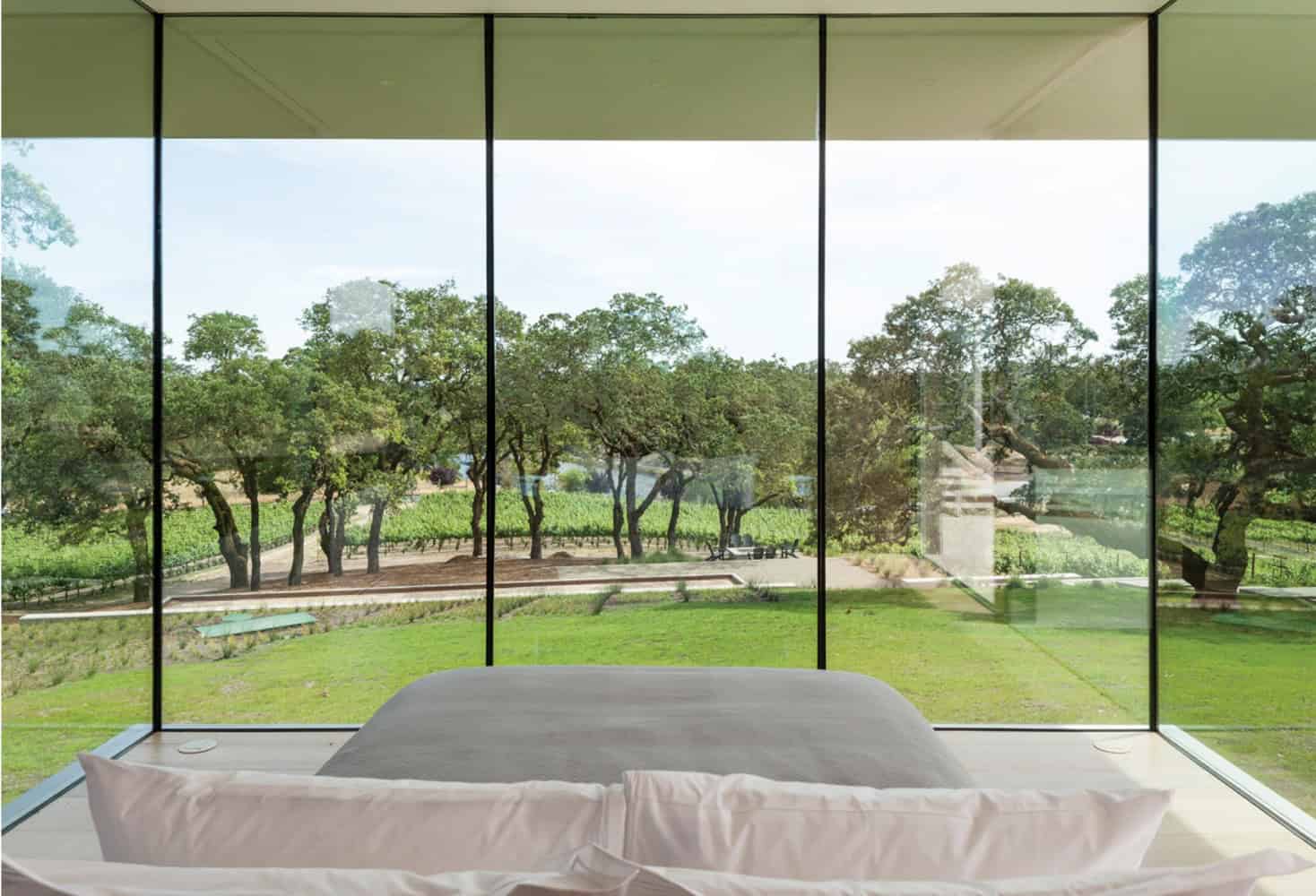 The detached guest suite, envisioned as a glass box projecting beyond the terrace edge, functions as a separate building while remaining connected to the main house by the low roof that spans between the structures. The guest house is screened from the main building while enjoying completely unobstructed 270-degree views of the landscape, and the interstitial space is used as a shaded outdoor kitchen and lounge with terrace and vineyard views on two sides.