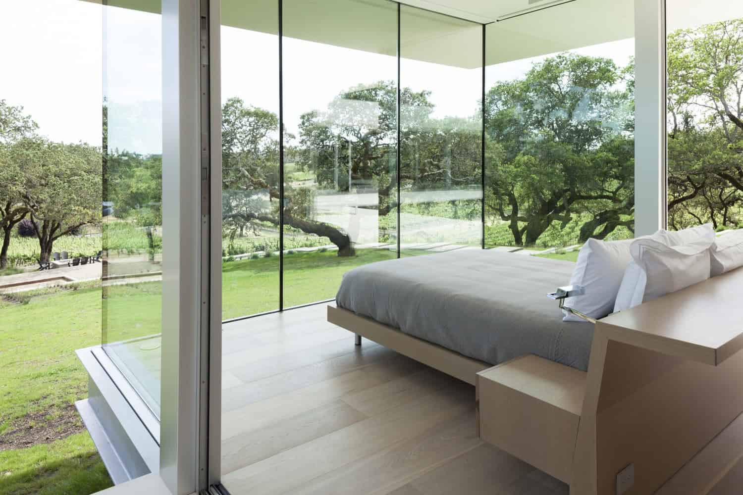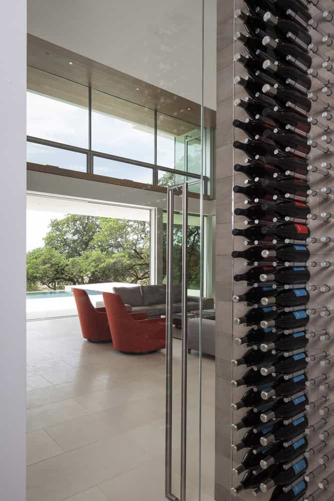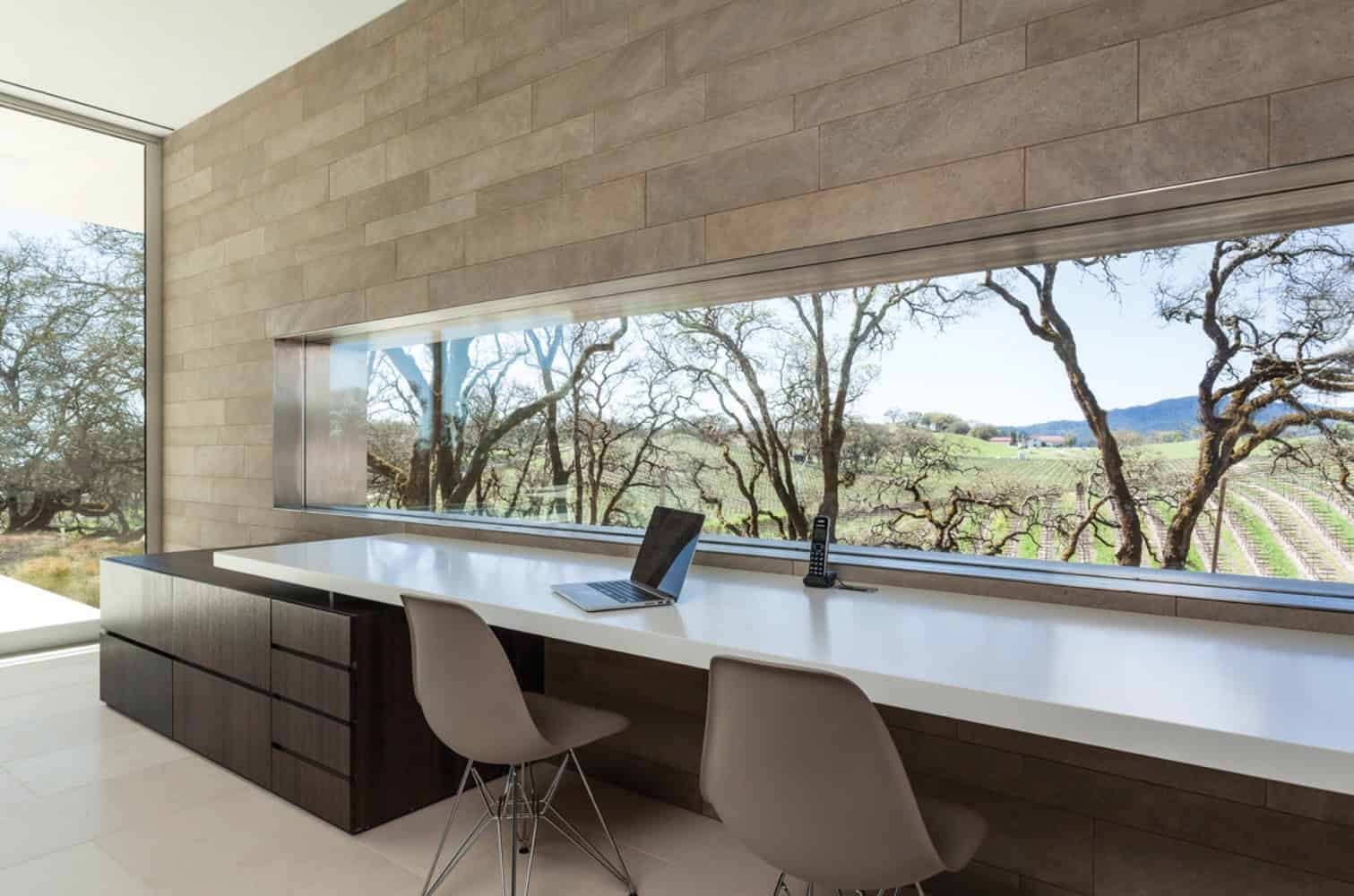 Equipment and materials for the vineyard are stored in the adjacent barn, clad in the same Windsor Stone as the main house, and a large parking pad accommodates trucks picking up new harvests. A second driveway separates the commercial activity from the residential, but traffic to and from the barn passes in front of the main house. Faced with these business operations on one side and an expansive view of the surrounding vineyards on the other, the building was designed with two distinct façade treatments on either side of a narrow, ‘T’-shaped plan: to the north, a relatively opaque entry court provides privacy while admitting daylight through a delicate vertical wood screen, while the south façade eschews solid walls in favor of double-height glazing.