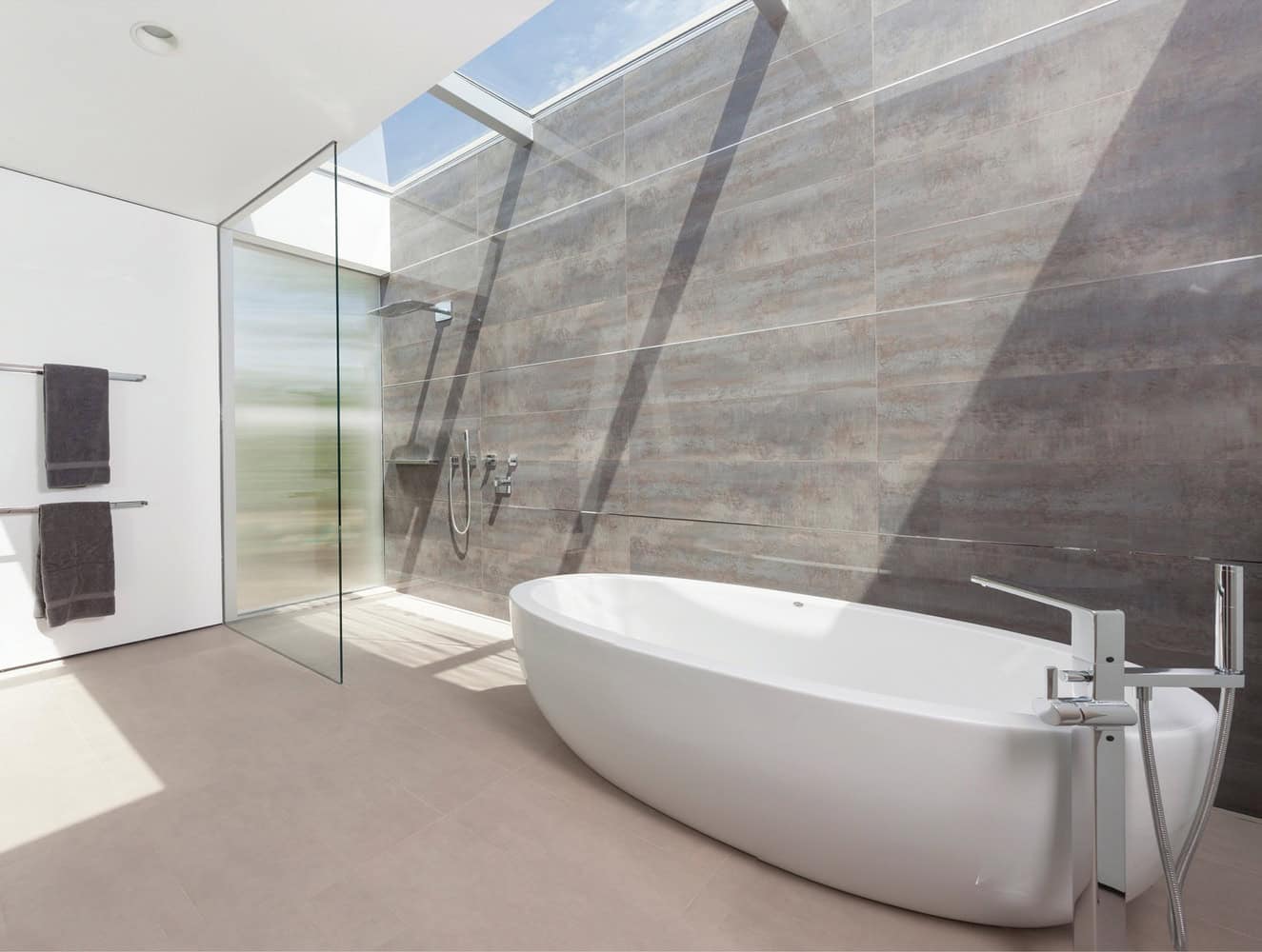 The plan of the house was designed to respond to family living, with public or shared areas on the ground floor and bedrooms above. The master bedroom is separated from the children’s rooms by a bridge spanning the double-height great room that takes up the majority of the lower level. Below, the kitchen and office both open up to the pool terrace, and in the great room a twenty-one-foot wide span of full-height sliding glass doors seamlessly extends the living space out onto the St. Tropez limestone pool terrace.