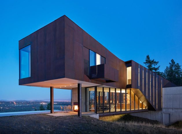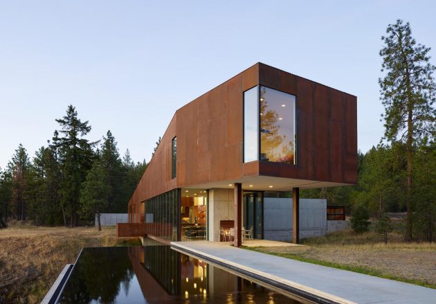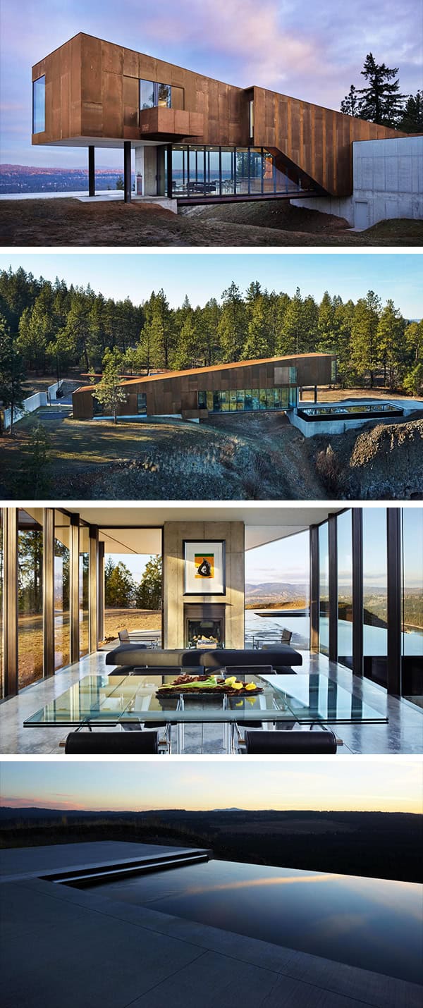 Perched on a volcanic basalt bluff overlooking Riverside State Park, the Rimrock Residence by Olson Kundig is a 5,200-square-foot home that embraces its dramatic setting while minimizing its impact on the surrounding landscape. The T-shaped structure not only responds to the site’s topography but also lifts the home above a natural game path, preserving vital wildlife movement between the mountains and river.