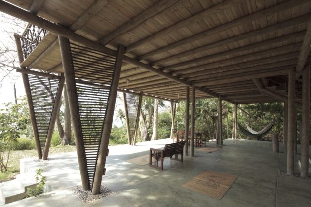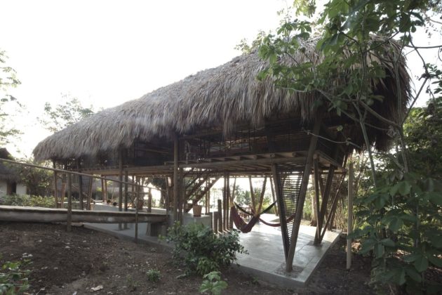 The Rio Cedro House in Colombia is a sustainable building that integrates itself with the surrounding tropical dry forest ecosystem. The house was built using cultivated, immunized and certified Caribbean Pine timber, treated with sustainable practices, in order to avoid using native woods. The roof was built using branches of the “Palma Amarga” and the enclosure elements were made of stems of the “palmalata” plant, both of which can be managed with controlled individual extractions.
