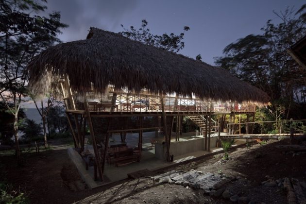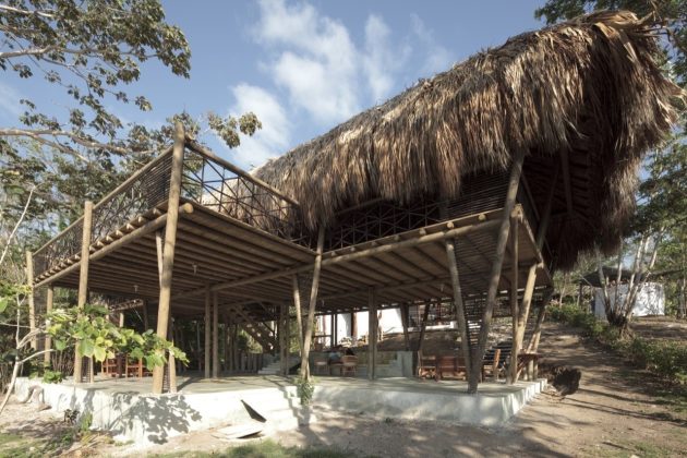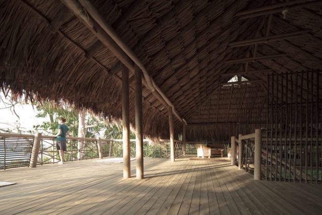 Following certain local construction strategies, the house is defined with an elevated and open social ground floor that acts like a covered platform that includes all the areas for the daylight activities. The living room, dining room, and hammock areas can all trade places on the same plane. In the first floor we find a lower profile around the perimeter, this defines a more intimate space designed for the night activities. In this floor you can enjoy the view of the intricate weave of the branches in the inner slopes of the roof. Once again we create a platform in which beds and small furniture can be moved around or even increase its numbers to enhance capacity. The difference between the levels provides a separation from the daylight and nocturnal activities, allowing a house that is pierced by the vegetation and weather on the ground floor, but with more control and restraint on the second level.