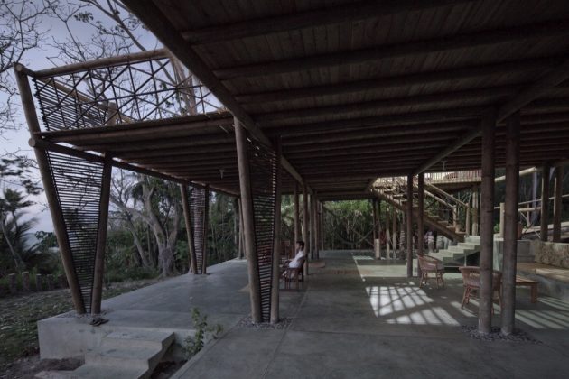 The building features an open and permeable design that allows passive cooling via crossed ventilations and precise bioclimatic qualities. The elevated and open social ground floor acts as a covered platform for all the areas for daylight activities, while the first floor provides a more intimate space designed for night activities. The difference between the levels provides a separation from the daylight and nocturnal activities, allowing a house that is pierced by the vegetation and weather on the ground floor, but with more control and restraint on the second level.