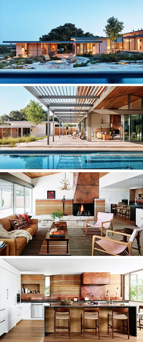 Stucco, cedar, steel, glass, and limestone complete the materials palette, with custom copper details appearing on the fireplace and front door. An outdoor fire pit, kitchen, dining and the screened sleeping porch further strengthen the indoor/outdoor connections.