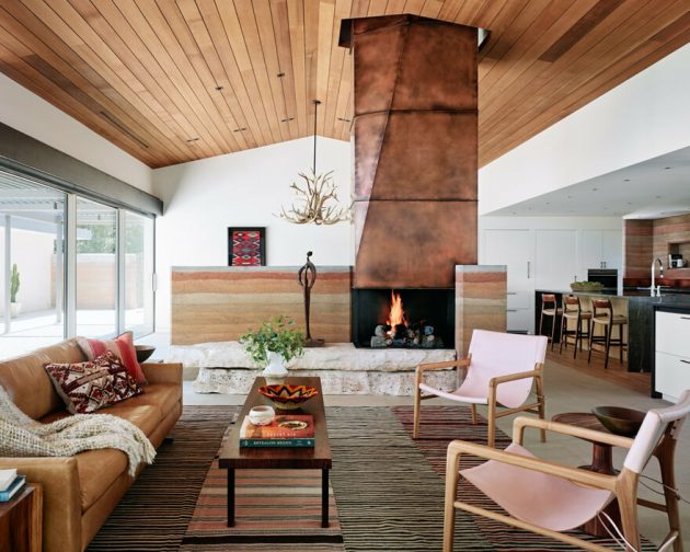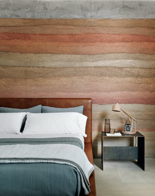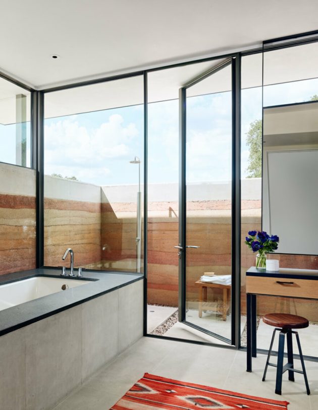Generous overhangs, steel trellises and wood screens protect the building further, filtering light when desired and shielding glare when needed. The massive rammed earth walls are visible from every room of the River Ranch, at times playing a main role and at others seeming to blend into the surrounding landscape.