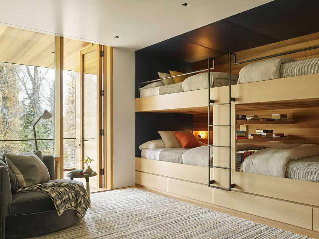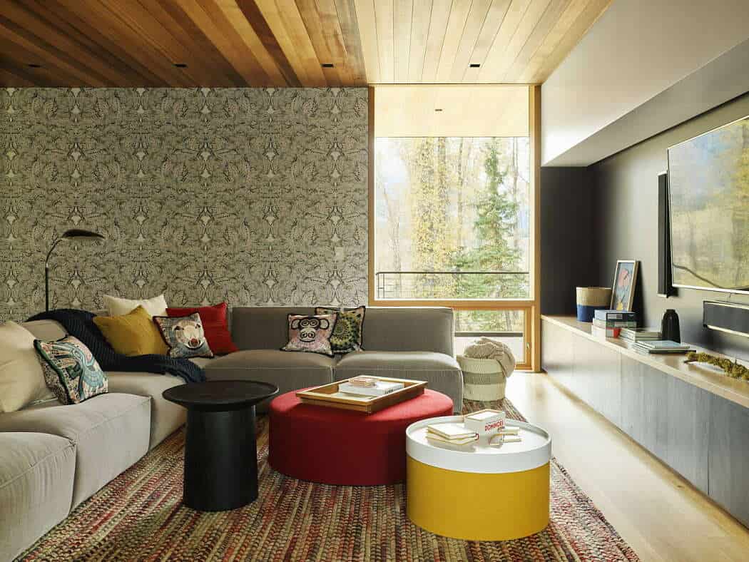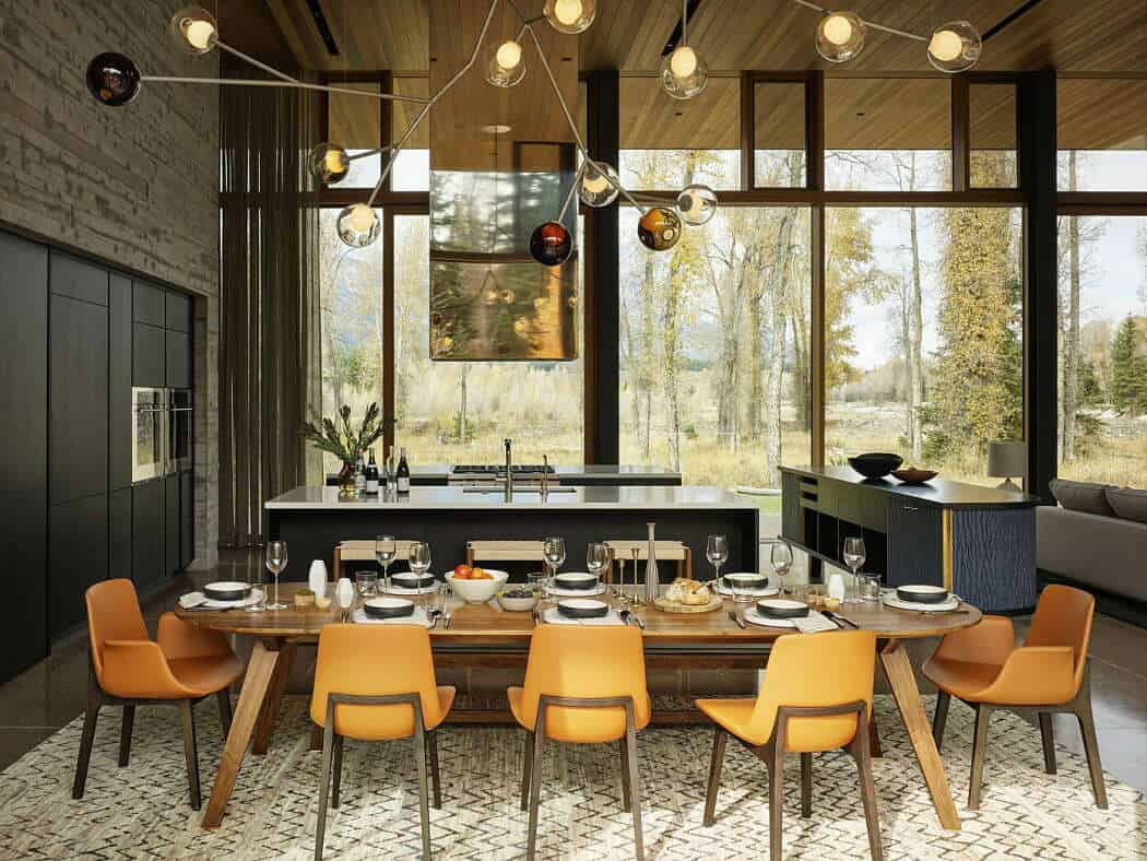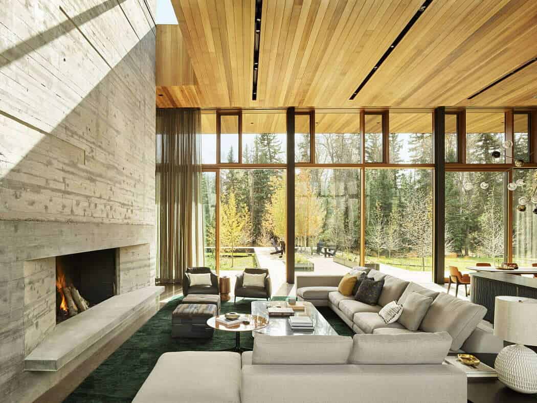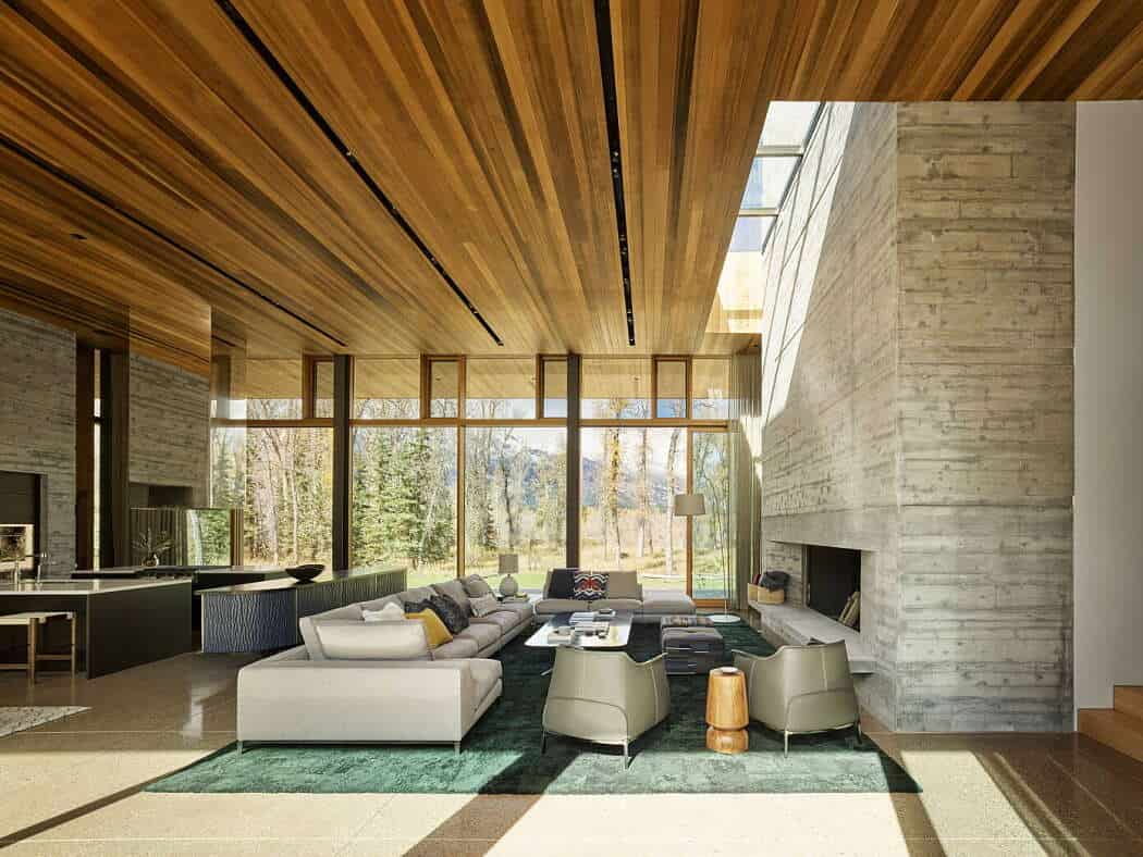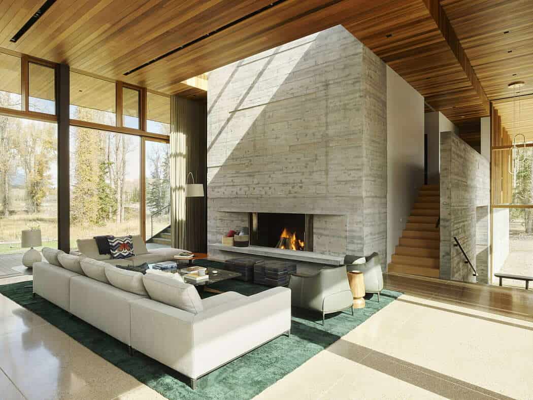To solve this, the architects studied the site’s seasonal changes and elevated the home five feet above ground level, opening the living areas to sweeping views of the meadow, river, and mountains. The result is a residence that feels light, transparent, and deeply connected to its natural surroundings.