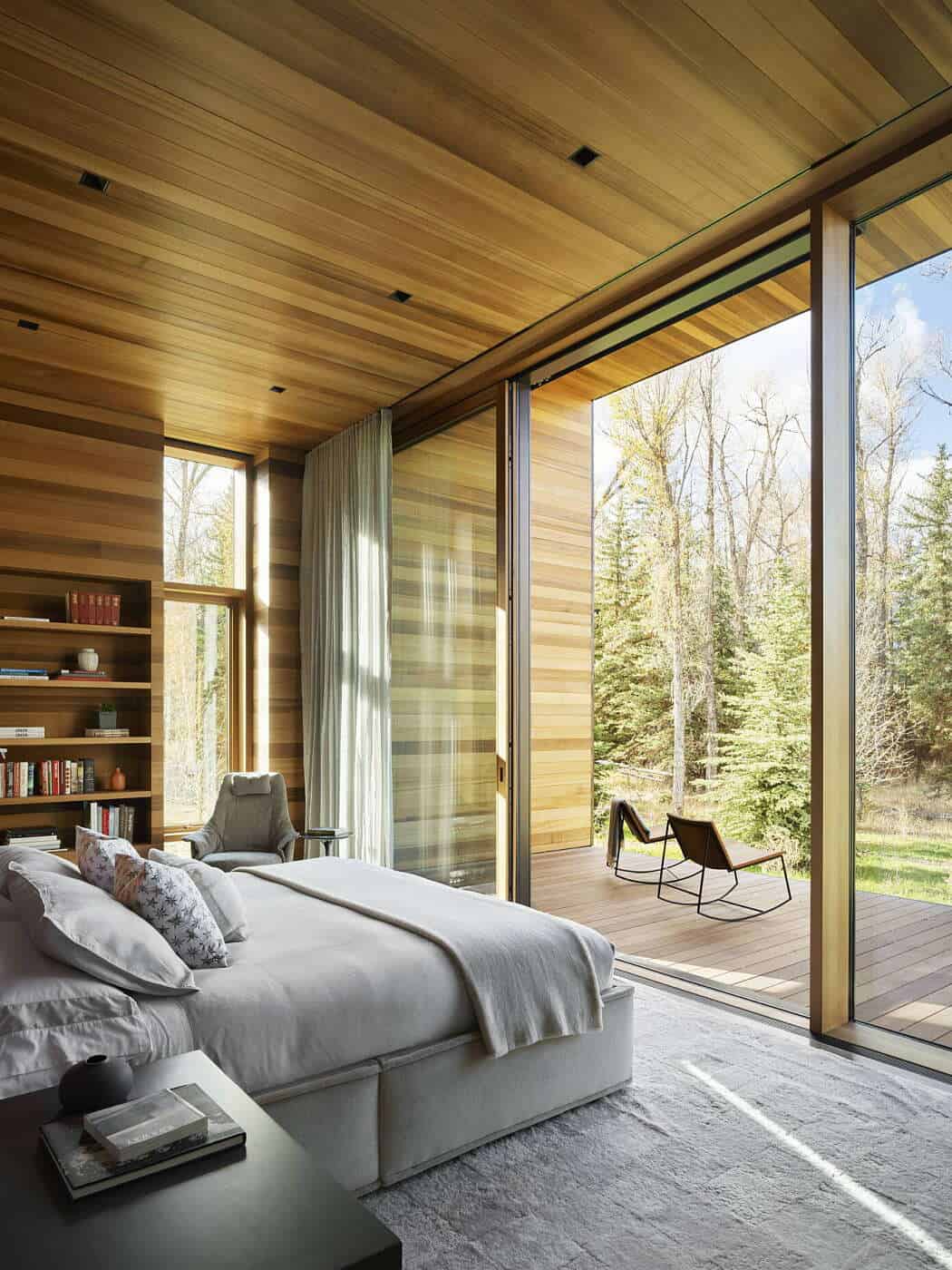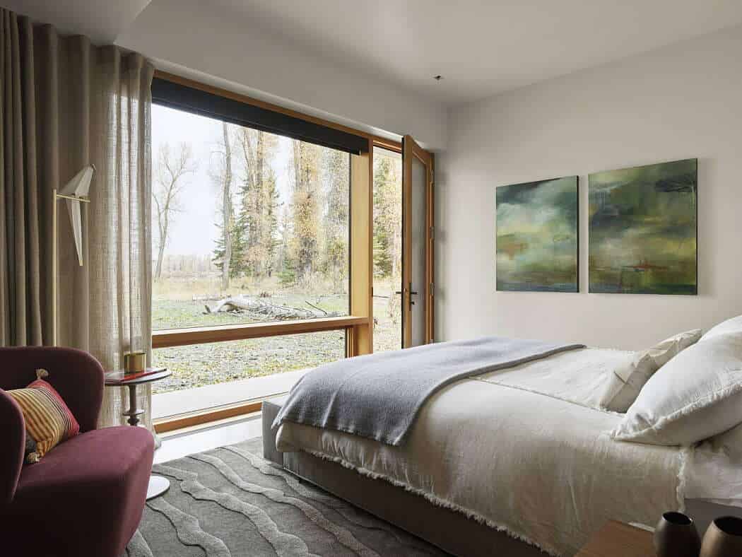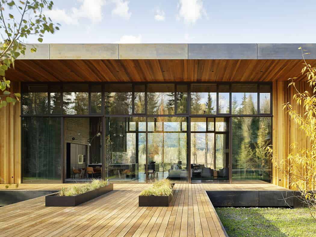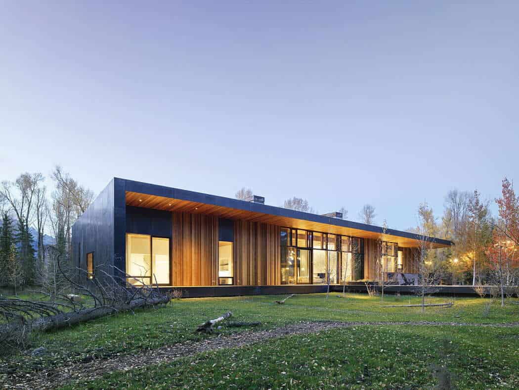 The Riverbend Residence by CLB Architects is a contemporary single-story dwelling located along the Snake River in Jackson, Wyoming. Set on a 20-acre property, the project faced unique challenges: a berm built by the Army Corps of Engineers blocked river views, and a dense cottonwood grove obscured the Tetons.