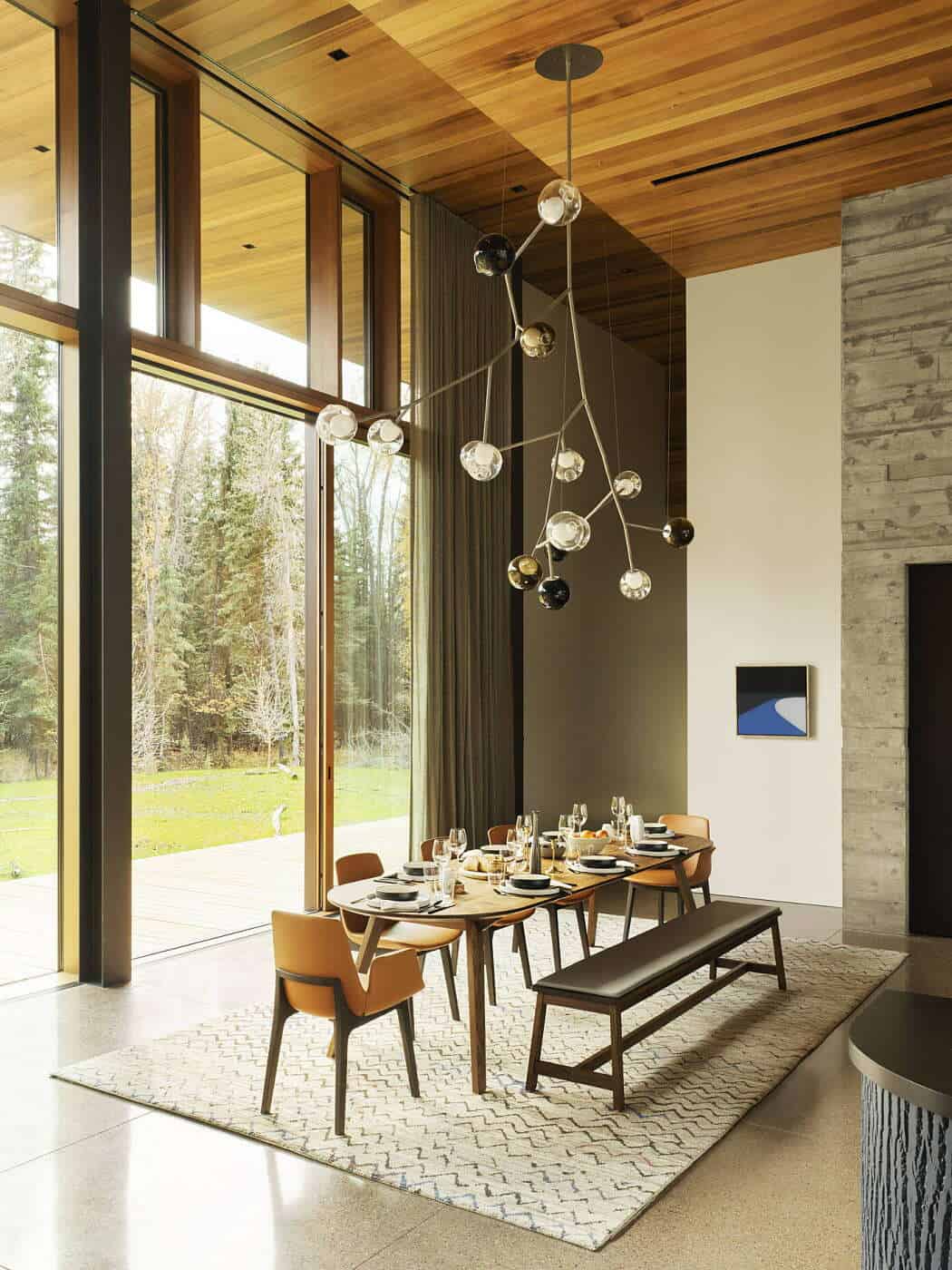 Inside, the architects collaborated with the clients to balance comfortable living with artistic expression. Engineered beech floors, painted millwork, and richly textured furnishings soften the home’s bold structure. Architectural lighting is integrated discreetly into the cedar ceilings, while decorative fixtures highlight key spaces with sculptural presence.