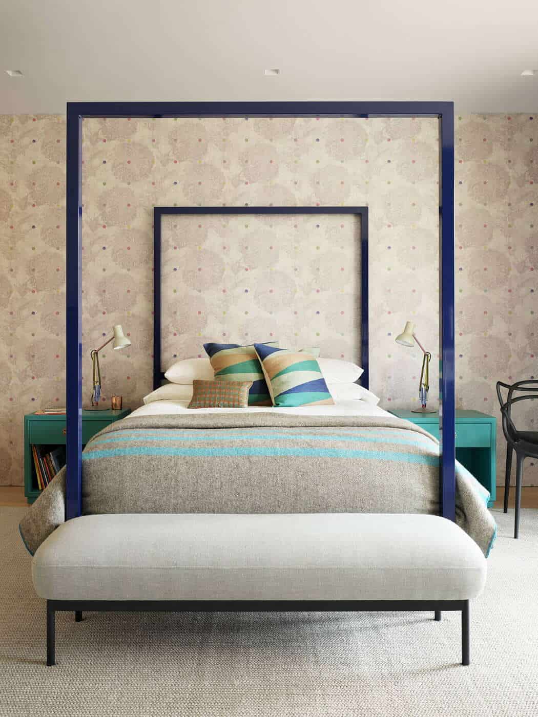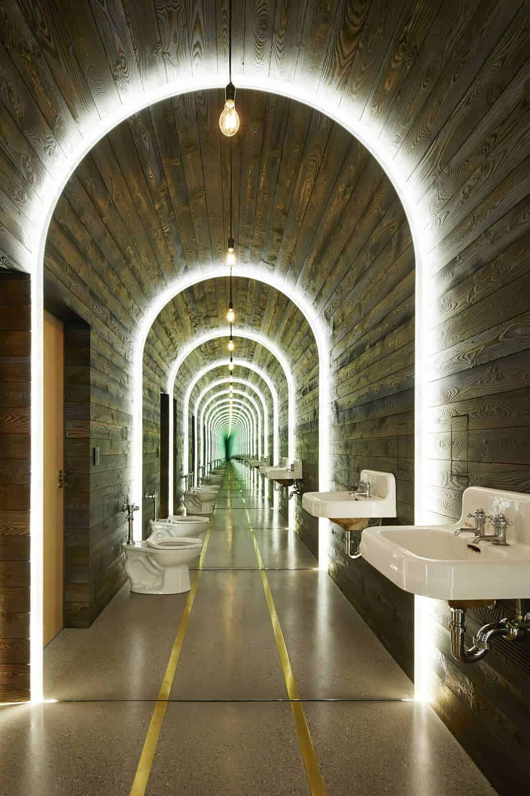 Even functional rooms become design statements: the powder room, for example, transforms into a dramatic trompe l’oeil tunnel, with arched mirrors reflecting brass inlaid railroad tracks for infinite effect.