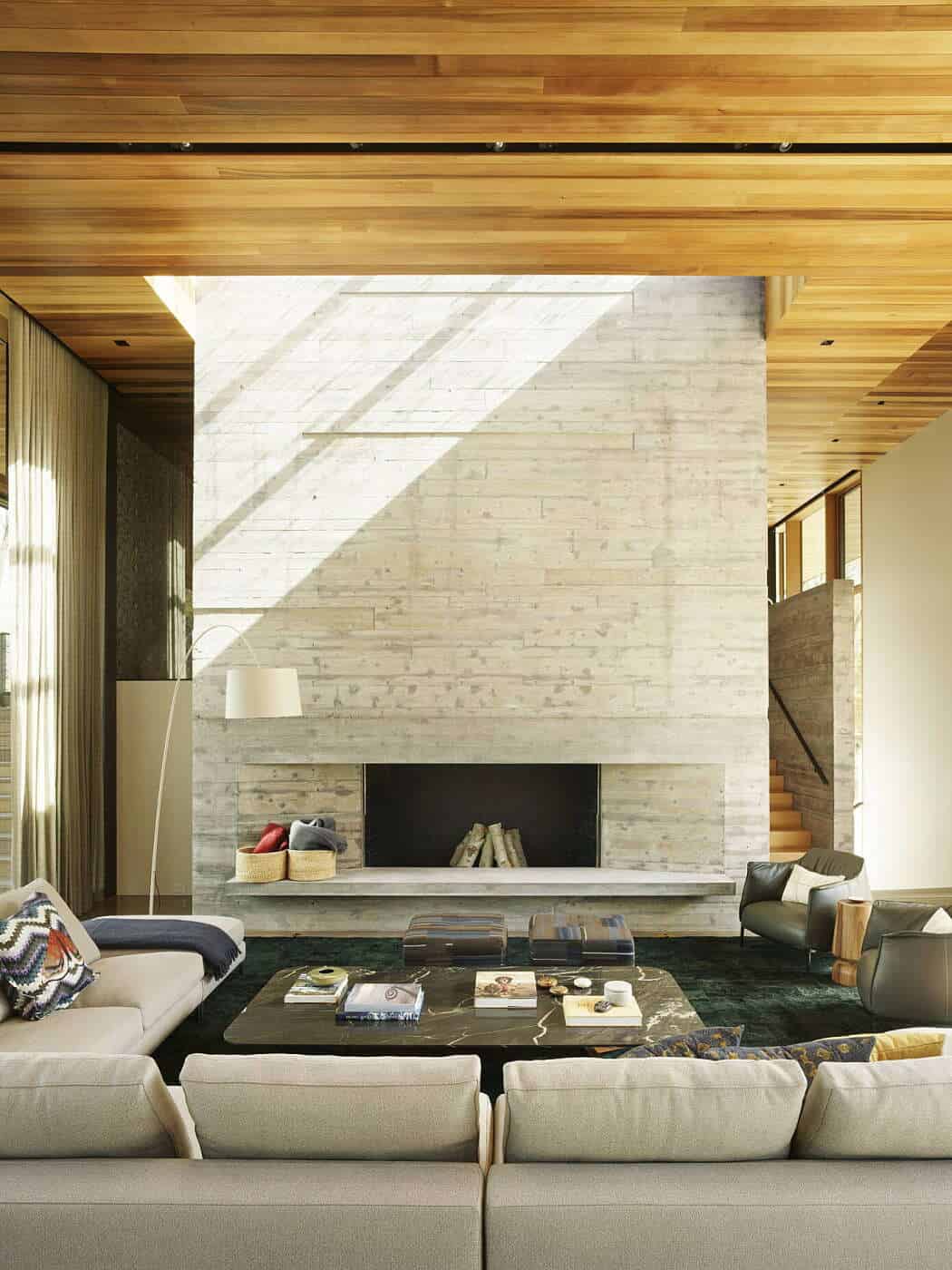 The double-height kitchen, dining, and living area is the heart of the home, opening on both sides to natural light. A board-formed concrete fireplace wall, detailed with alternating recessed and projected boards, grounds the interior while echoing the rugged textures of the exterior.