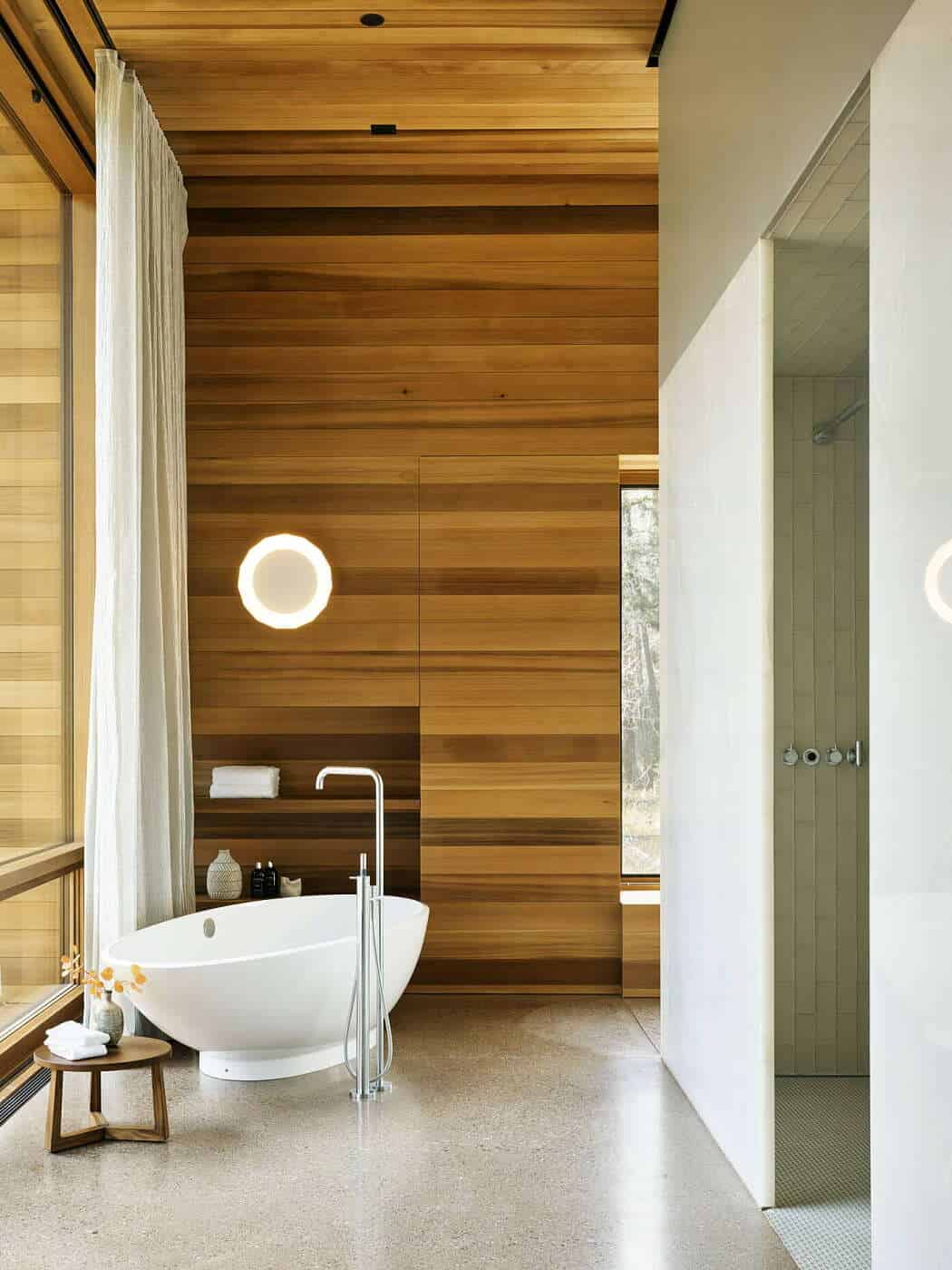 The material palette is modern yet natural: varicolored cedar laid in an undulating pattern adds warmth and shadow play, contrasting with the weathering steel exterior designed to patina over time. Board-formed concrete, white plaster, and cedar ceilings continue inside, while architectural concrete floors infused with green glass add subtle texture.