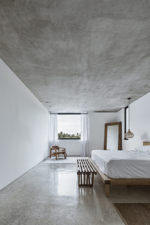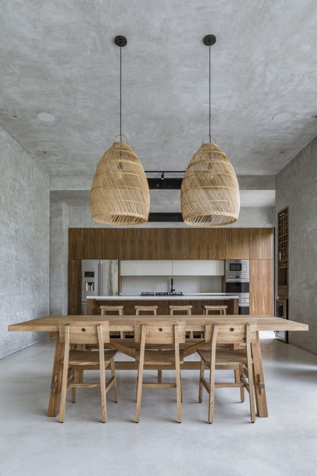 The selection of interior materials becomes very simple by using polished concrete as the protagonist that takes over the house. It is spread over walls and ceilings and allows the tropical wood carpentry and the selection of furniture to stand out as elements of warmth evoking nature in a rustic and minimalist environment.