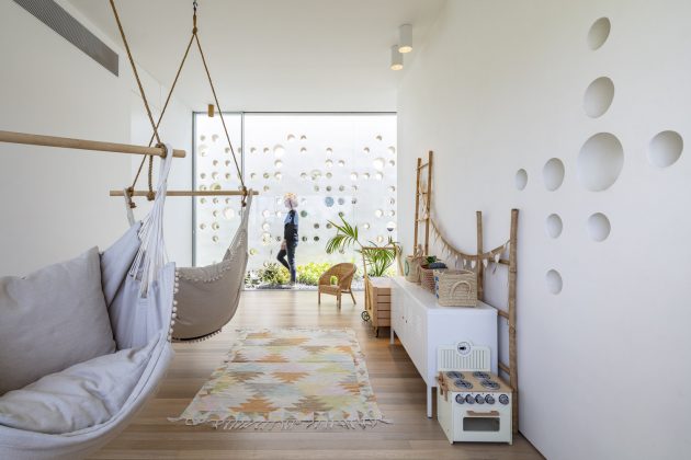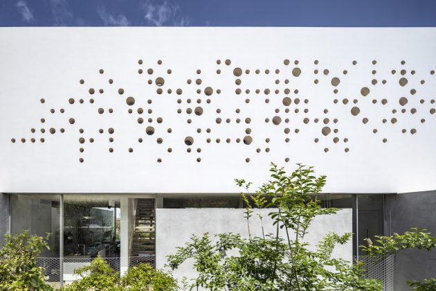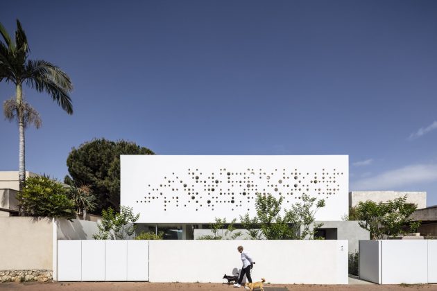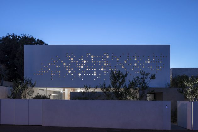 The concrete cylinders that were drilled out of the surface are scattered along the garden, used as floor paving. The perforated wall transfers natural light into the house during daytime and by night transfers artificial light outside, illuminating the street with its special glow.