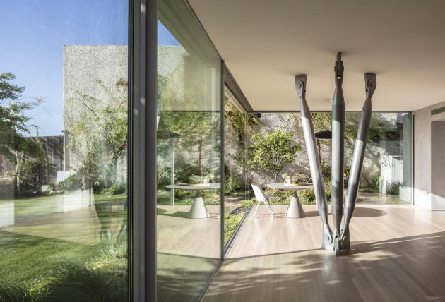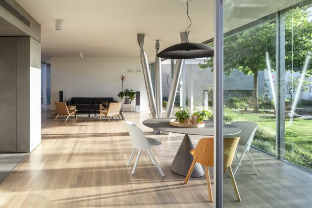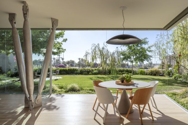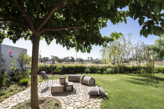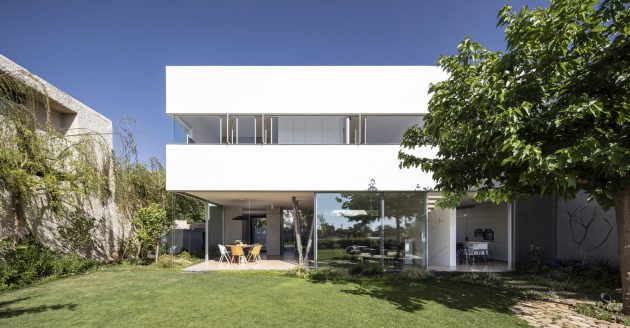 Anderman Architects have built the Round Edge House in Ramat Hasharon, Israel. It is a house of almost 3,300 square feet of living spaces underneath two contrasting facades. One of them is widely open, opening up the interior towards the landscaped areas outside while the other one is all about privacy, closed up with a sort of a “laced-concrete” look.
