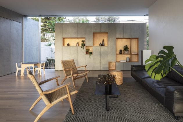 The punctured wall works as a double function curtain. it evokes some of the neighborhood’s essence into the house and diffuses the landscape back into the street behind.