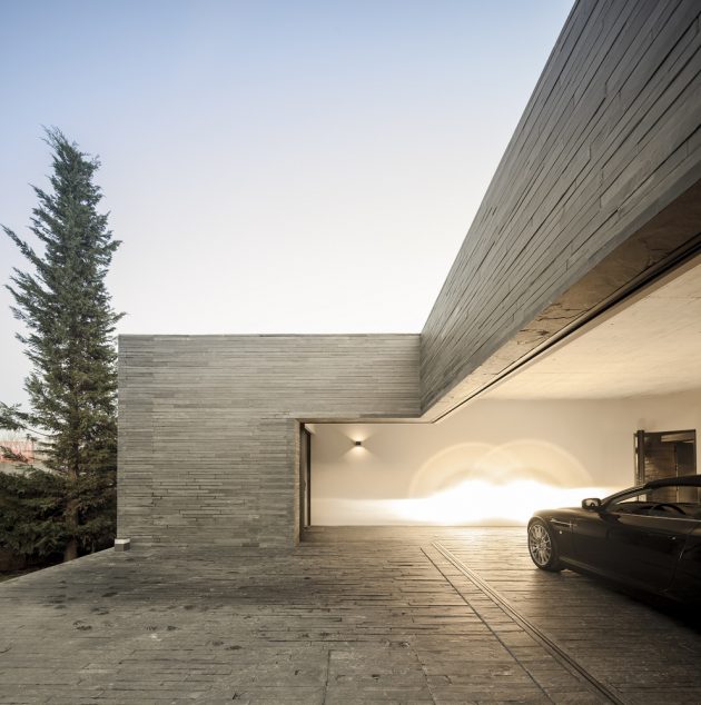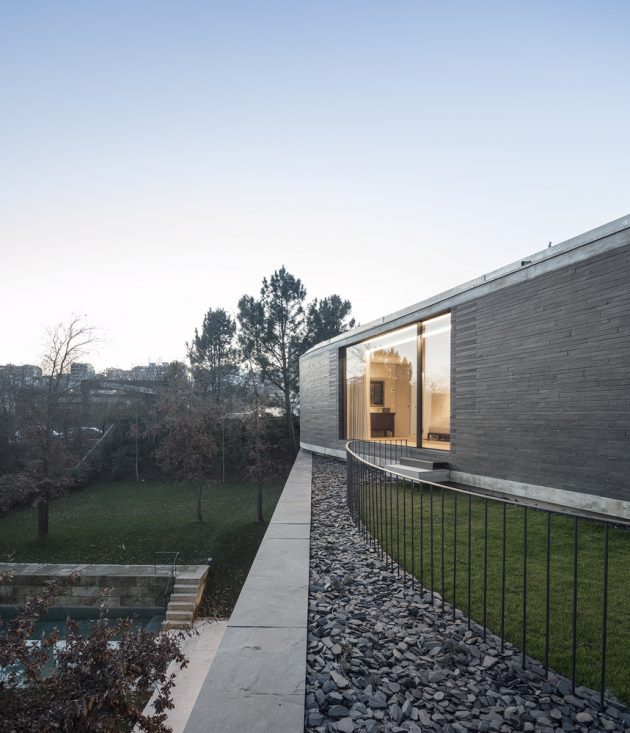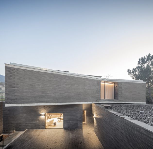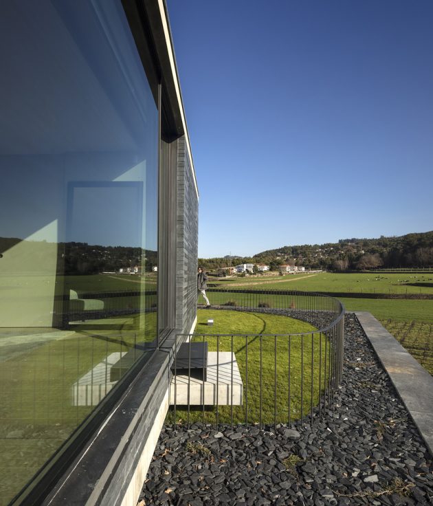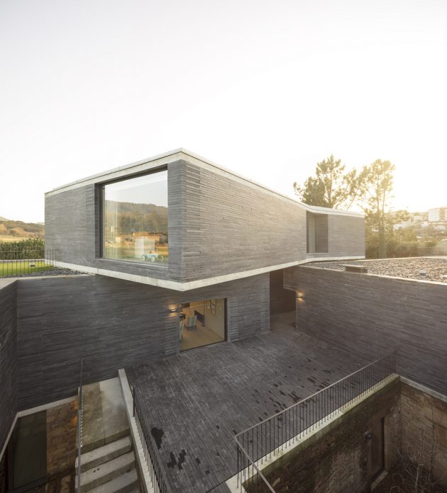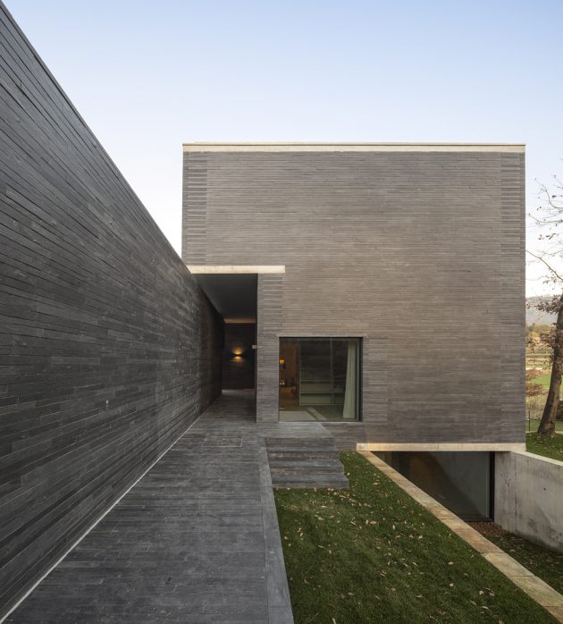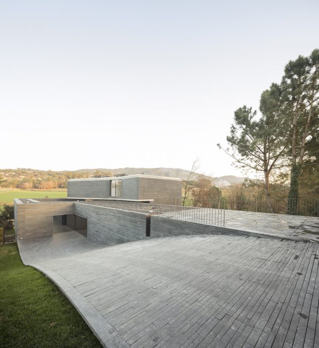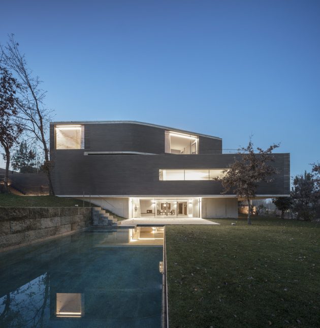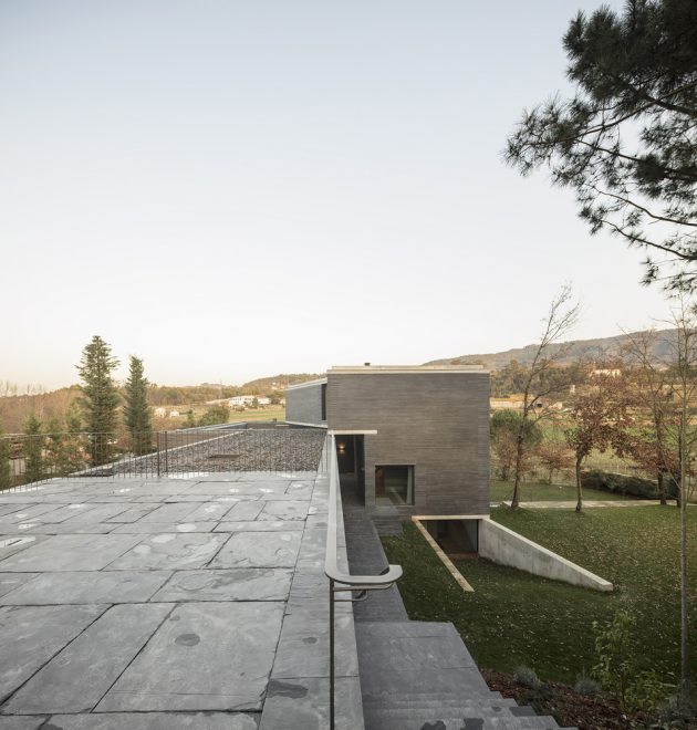 The new residence unfolds across 643 m² over three levels, each with distinct purposes yet bound by material continuity. Constructed entirely of reinforced concrete and clad in dark slate, the house feels both timeless and rooted in its geological context.
