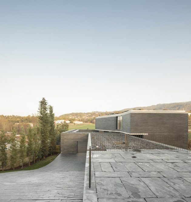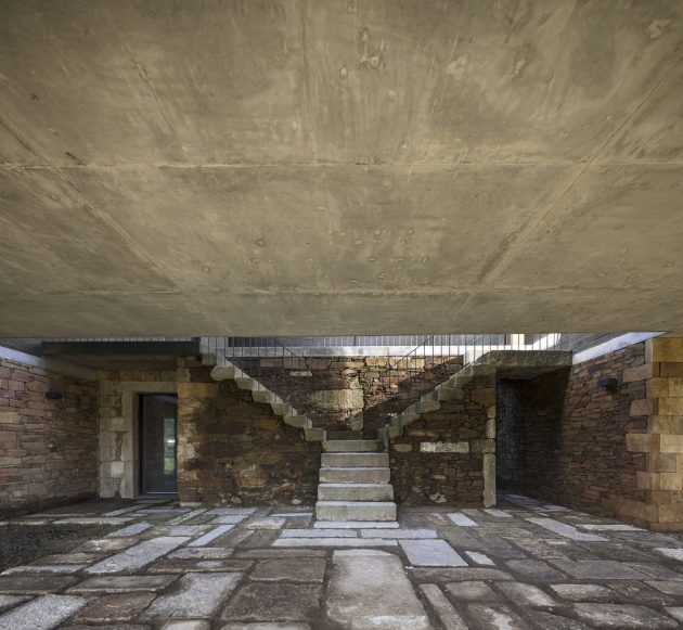 Material Narrative: The contrast of slate, schist, and concrete grounds the project in Portuguese identity.