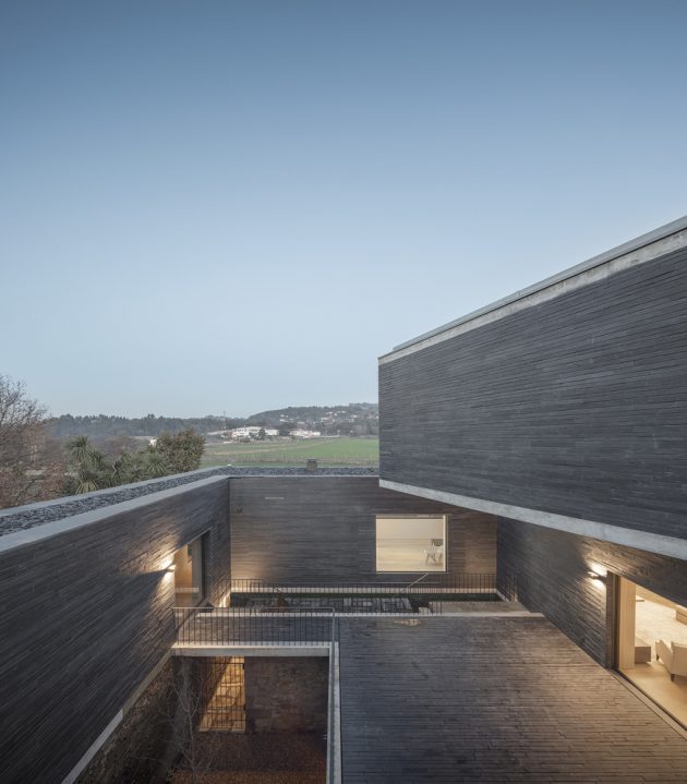 Inside, natural light cuts through courtyards and voids, animating the weight of the materials. The dark exterior mass opens into luminous interiors that shift in tone as daylight filters through.