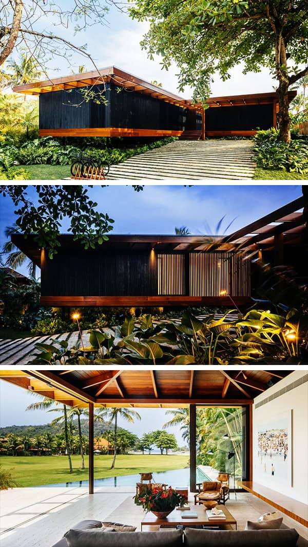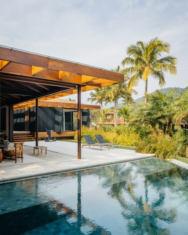 The charred wood façade gives the house a modern, resilient skin that blends with the tropical surroundings.