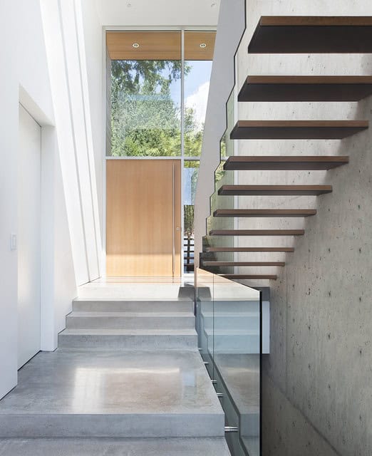 Russet Residence by Splyce Design: This project is located in West Vancouver on a steep site with mature cedar and douglas fir to the west and an ocean view to the south. The house responds to these conditions by nestling itself into the hill while also projecting out over it to maximize views and connectivity to the landscape. Due to its proximity to the rugged and sloping creekside bank to the west, the house was subject to strict environmental and geotechnical conditions, including a required setback from the top of the bank that pushed the building’s foundation eastwards. The resultant footprint was awkwardly narrow, so to gain back valuable space, a portion of the main and upper floor is cantilevered back out past the foundation, allowing the native creekside vegetation to grow up, under and around as an uninterrupted, wild, forest floor. This reclamation of space is clearly pronounced in the dining room, where it projects out fifteen feet unsupported. By eliminating window frames and extending the glazing panels on all three sides of the room, past the floor and ceiling planes, the space dissolves into the adjacent forest canopy and provides framed views though to the ocean beyond.