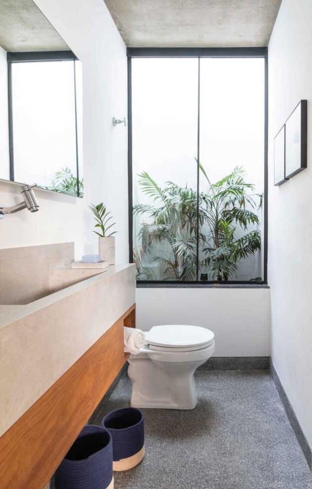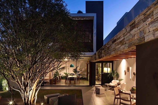 The house features a central atrium with a double-height ceiling that houses a tropical garden and a staircase, which connects and organizes the spaces and circulations of the residence. The living and dining rooms, which open fully to the back garden, are located under a block of dorms that open to the front and the bottom of the lot. The outdoor space is designed with a stone gabion bench and a ground fire next to a lush jabuticabeira Sabará tree, which dominates the backyard and gives the house its name.