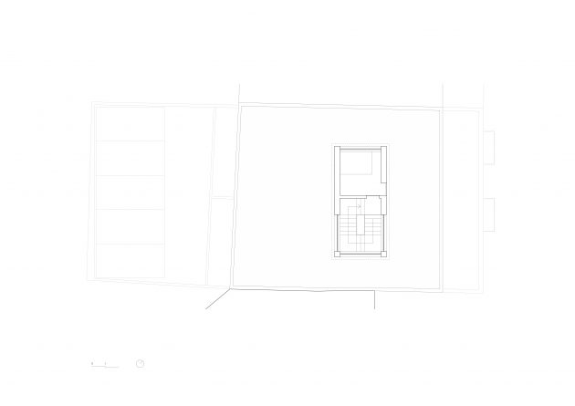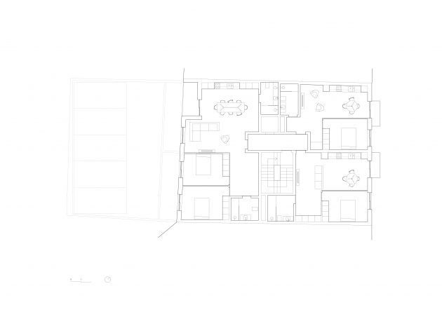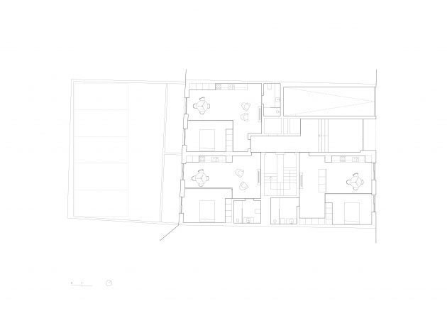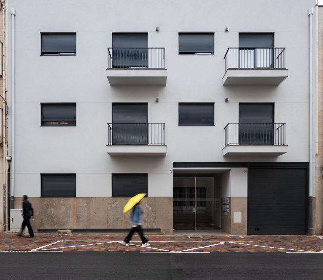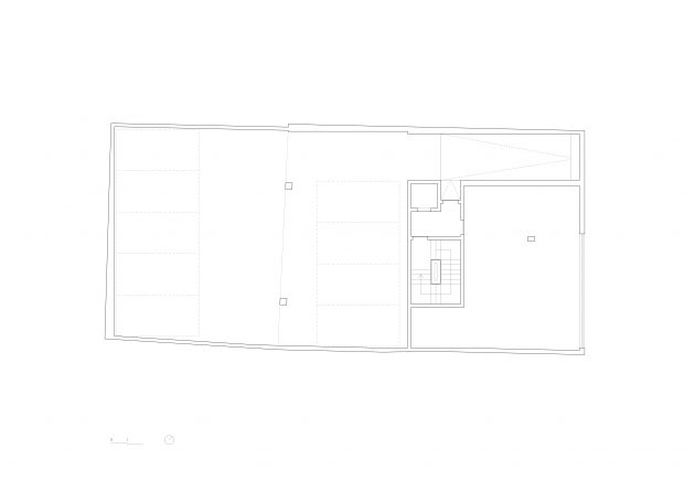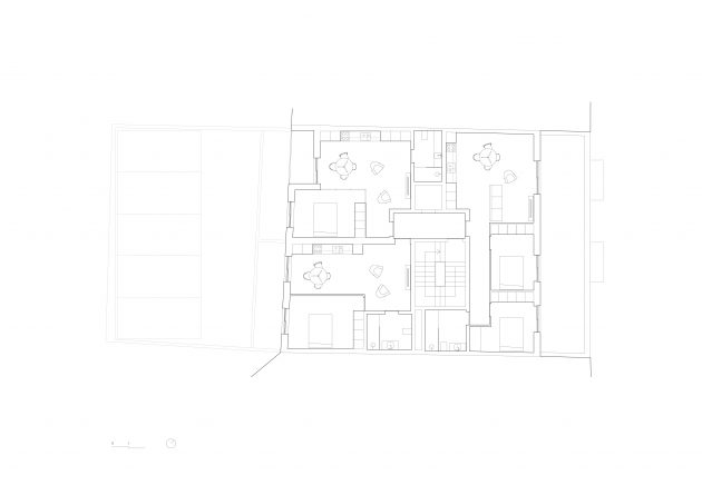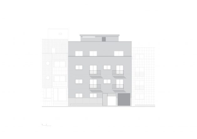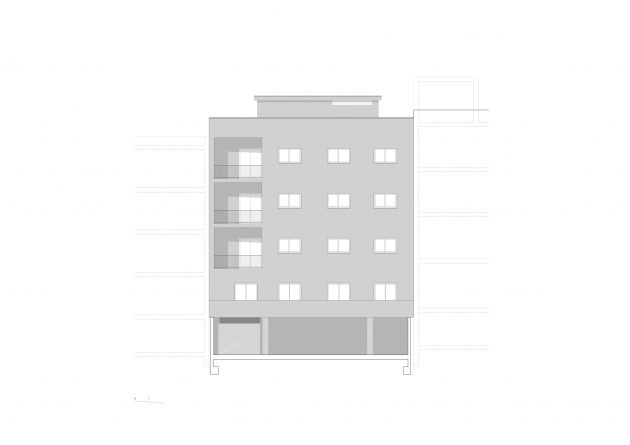 The building appears as a volume at the street level, that gets suspended in its inner quarter over the basement floor, where the parking lot is located. Basically, it’s a suspended volume without interfering with the neighboring ones.