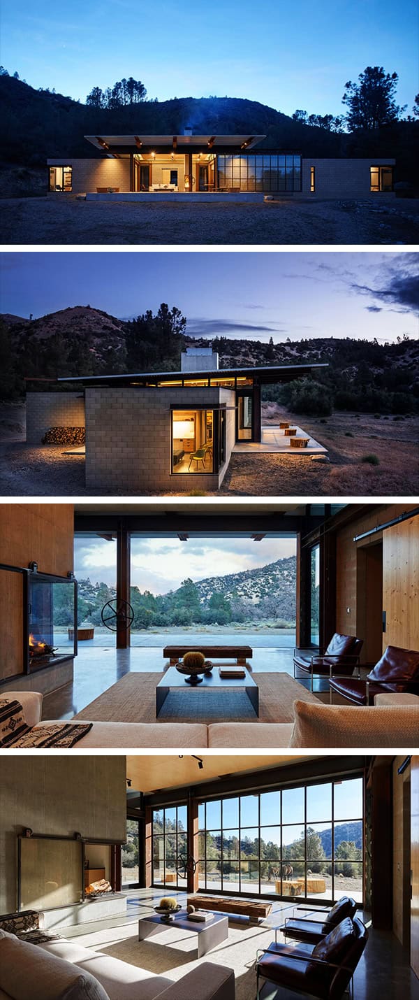 Inspired by the concept of tents gathered around a campfire, the layout of Sawmill Retreat consists of three wings radiating from a central hearth. This main living space serves as the social heart of the home, featuring a dramatic 12-by-26-foot retractable window wall that, when opened via a hand-turned wheel, blurs the boundary between interior and exterior and transforms the adjacent patio into a fourth “tent.”