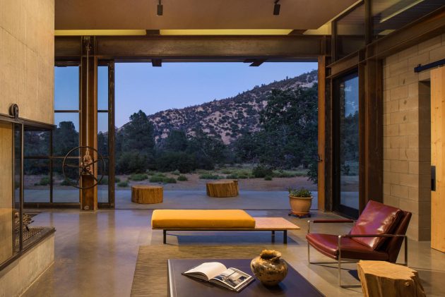 Sawmill was built for resilience. The fire-prone summers and freezing winters of the high desert called for a palette of durable, low-maintenance materials. Olson Kundig employed a “scavenger” design approach, utilizing salvaged wood, recycled steel, and other reclaimed components to reduce environmental impact and create a home with a raw, grounded aesthetic.