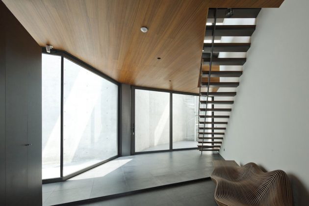 The site’s constraints—a trapezoidal, sloping plot of approximately 372 square meters surrounded by narrow alleyways—presented unique challenges. To maximize space within the 30% building-to-land ratio and 60% floor area ratio, the architects excavated a full basement level, resulting in a total floor area of 453.75 square meters across three levels.