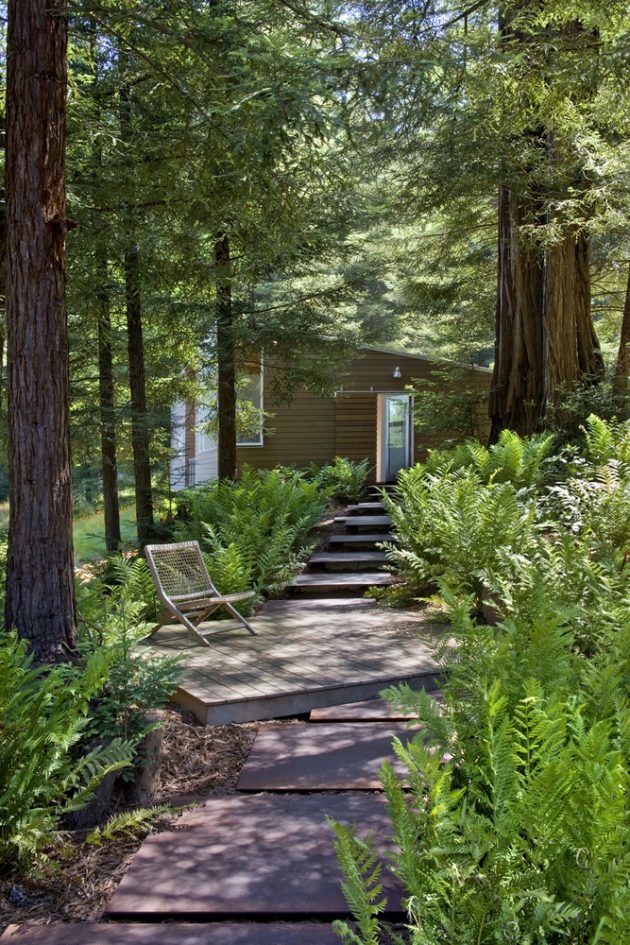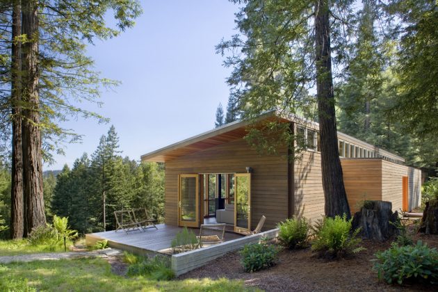 This wooden-clad home is surrounded by a stunning redwood forest blessing the interiors with a breathtaking sight on each side. To make the most of this, the design includes plenty of glazed surfaces that also let natural light through.
