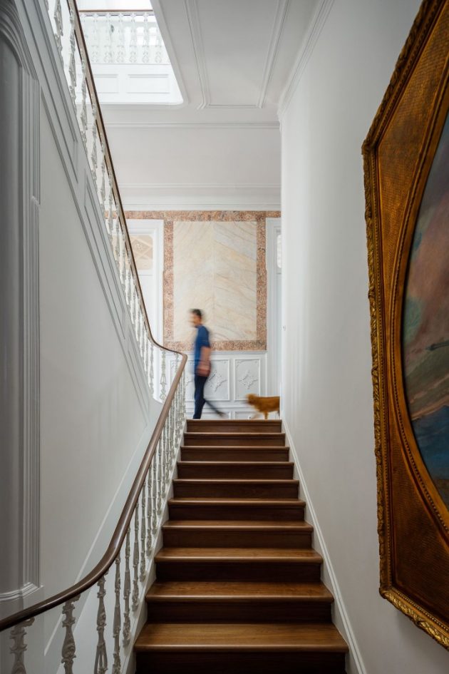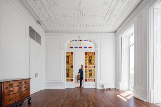 The original aspects and construction techniques, sometimes exuberant, sometimes handcrafted, now gain a new stage with the conservation and recovery of the impressive plaster ceilings that adorn the entire 1st floor, the marble-effect paintings in the corridors or the partition, now a feature wall in one of the sanitary facilities.
