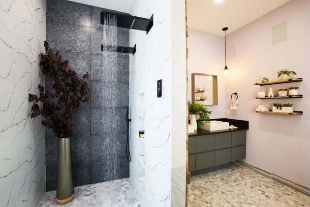 The wood wall offers warmth, the plants bring life and the floating shelves add a fun element to the bathroom. A black granite top not only makes a statement in the room but is also very durable and easy to clean.