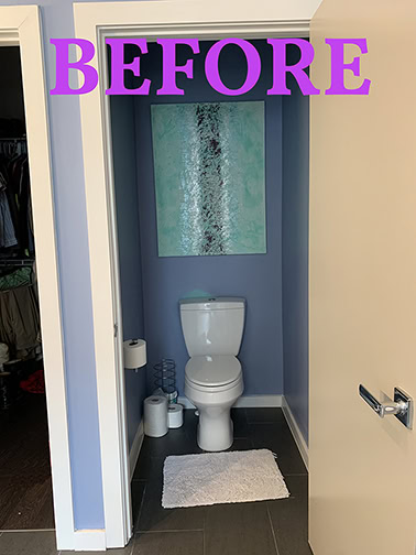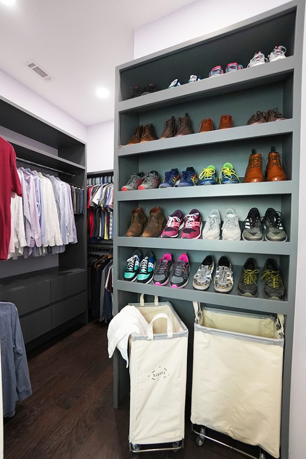 The toilet was moved to the old shower location which allowed the clothes closet to be expanded. Custom gray cabinetry in the closet allowed space to be well utilized: a vertical shoe cabinet with rolling laundry hampers underneath, a large dress valet cabinet with full extension drawers underneath and shelves with hanging space in the rest of the closet. Wood flooring allows the closet to stay warmer.
