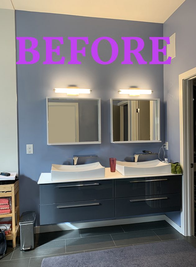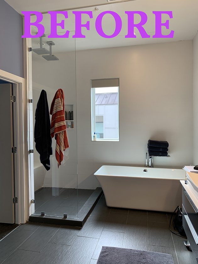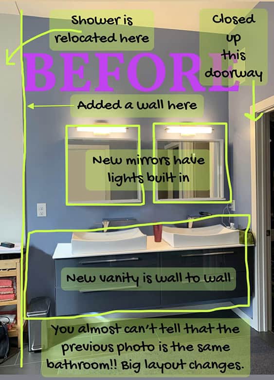 In the new layout, the bathtub was removed to create a larger shower with wall mounted multifunction shower heads, a handheld wand and a digital shower valve. A wall was built to accommodate a larger bathroom vanity for storage.