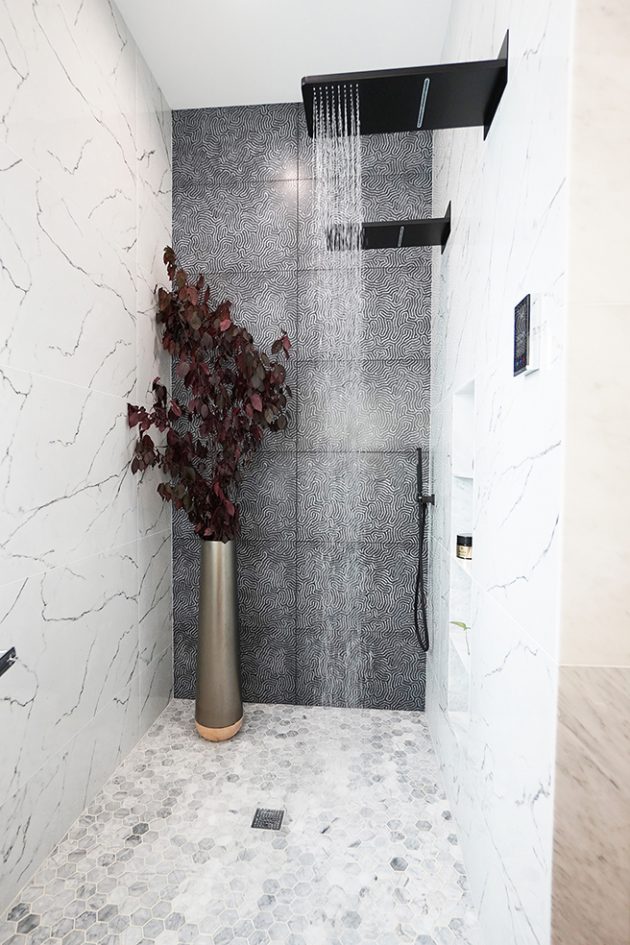 The bathroom floor is composed of marble mosaic tiles and epoxy grout was used to ensure long lasting white grout that doesn’t stain. White porcelain that is patterned like marble was installed in the shower from floor to ceiling and an accent tile with a cell pattern on the back of shower wall.