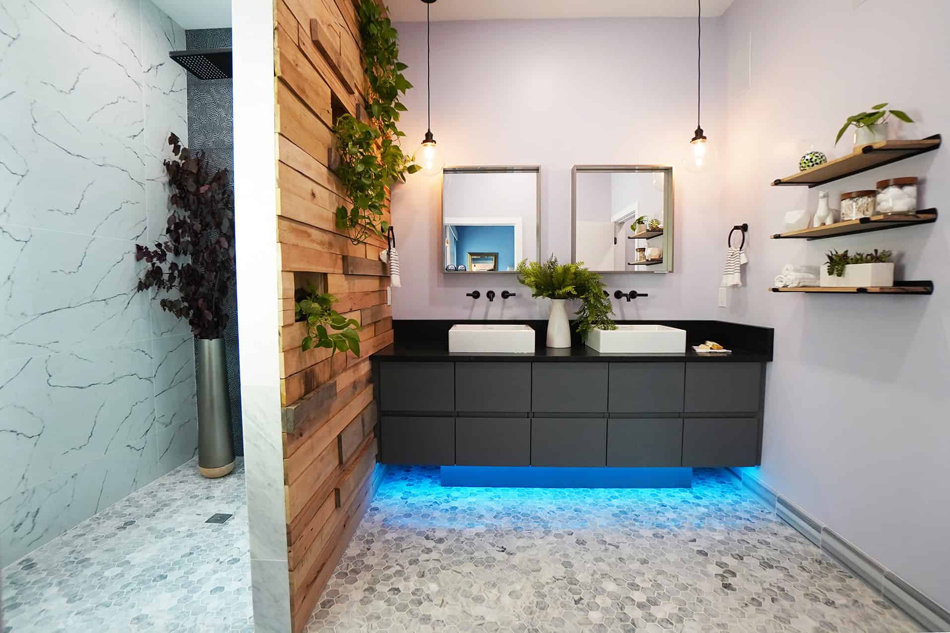 The wood wall offers warmth, the plants bring life and the floating shelves add a fun element to the bathroom. A black granite top not only makes a statement in the room but is also very durable and easy to clean.