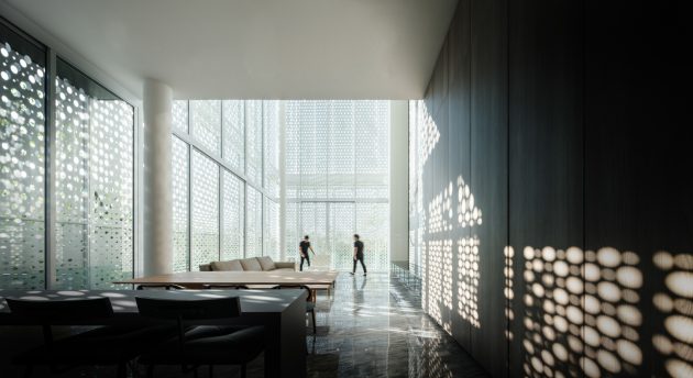 The graphic of the façade holes is creatively punched imitating to the overlaid tree leaves. During daytime, when the sunlight shines in the room, it will create the same effect similarly to sitting underneath the tree and absorbing the sunlight that shines through the leaf layers. The sizes of the holes are also determined accordingly to the usage of the function inside. For example, the holes of the living-room perforated facades are punched larger at the standing level and the couch-seating level, while the holes at the sleeping level inside the bedroom are punched smaller in order to secure privacy. At night, when the internal light shine through these holes, the living quarter will become a lantern, leading the way home. However, with AAd’s careful design, the outsiders will not be able to see what is inside due to the level of these holes punched.