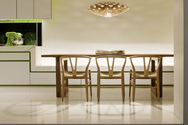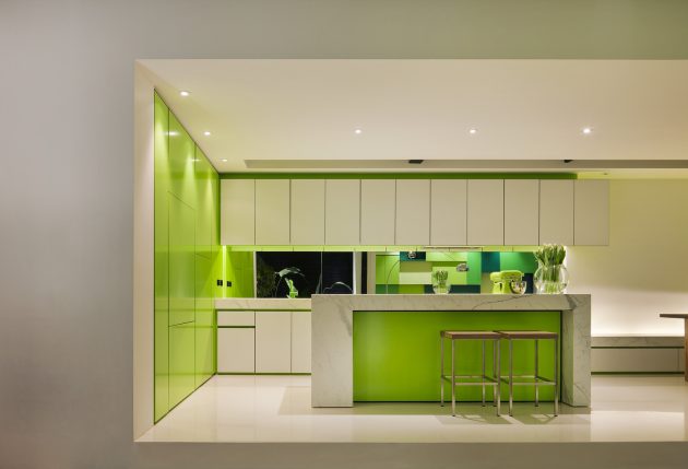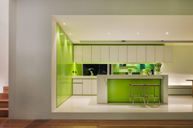 The interior palette is predominantly white, serving as a neutral backdrop for the client’s chosen highlight color: green. Green became a natural choice, linking the design directly to the garden while reinforcing the project’s identity.