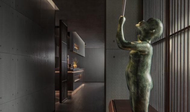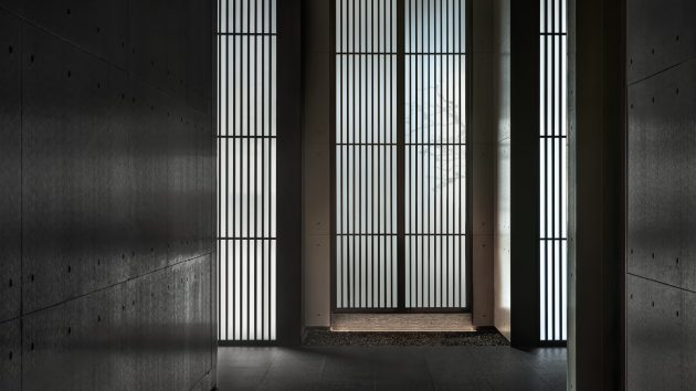 From the entrance, visitors experience a design imbued with ritual and symbolism. A hitching post at the threshold embodies the meaning of welcome, while also carrying the connotation of warding off evil and blessing the space. Inside, the atmosphere is defined by darkened shadows, quiet elegance, and an interplay of light and material.