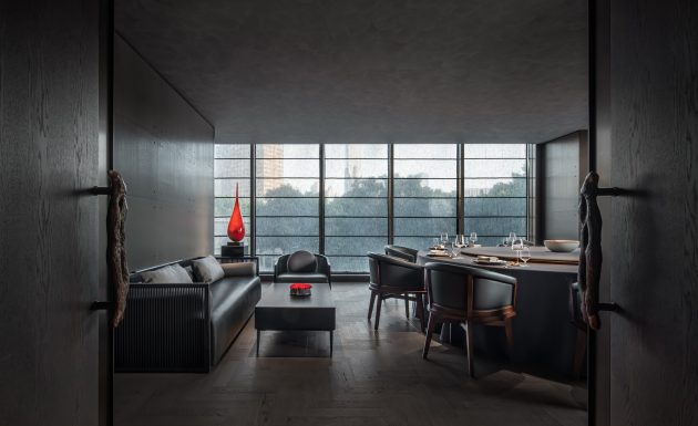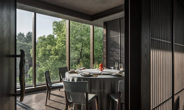 Expansive glass curtain walls invite natural light and city views deep into the space, creating a dialogue between the restaurant and its urban surroundings. Liu Daohua’s lighting design enhances this relationship, imitating the qualities of daylight to heighten the spatial experience.