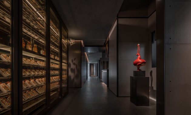 Throughout, red accents—artworks, details, and furnishings—add depth and vibrancy, symbolizing vitality and auspiciousness. These punctuations of color build an interactive relationship between art and architecture, enriching the sensory dimension of dining.