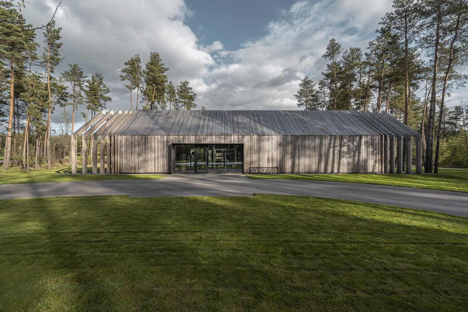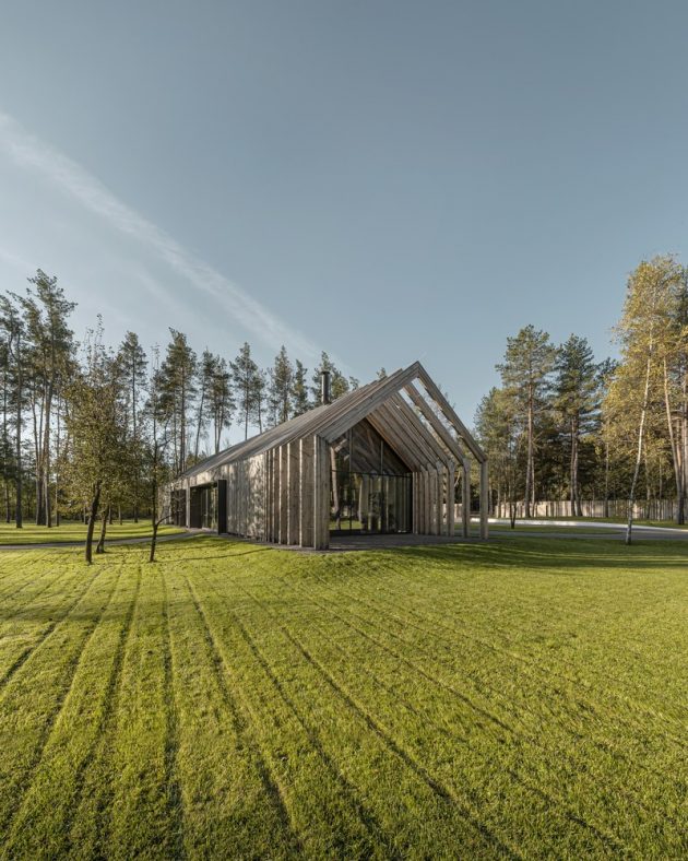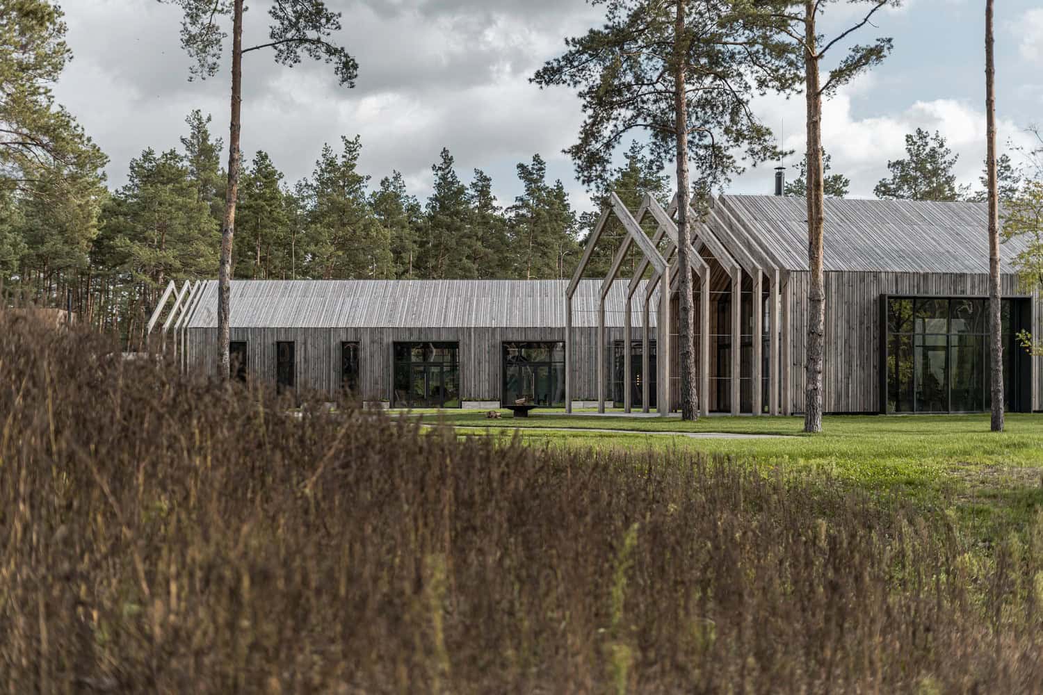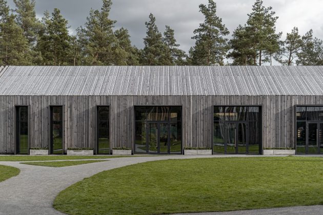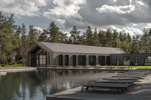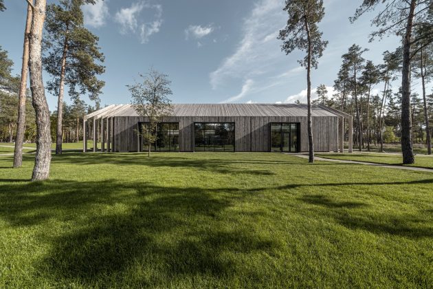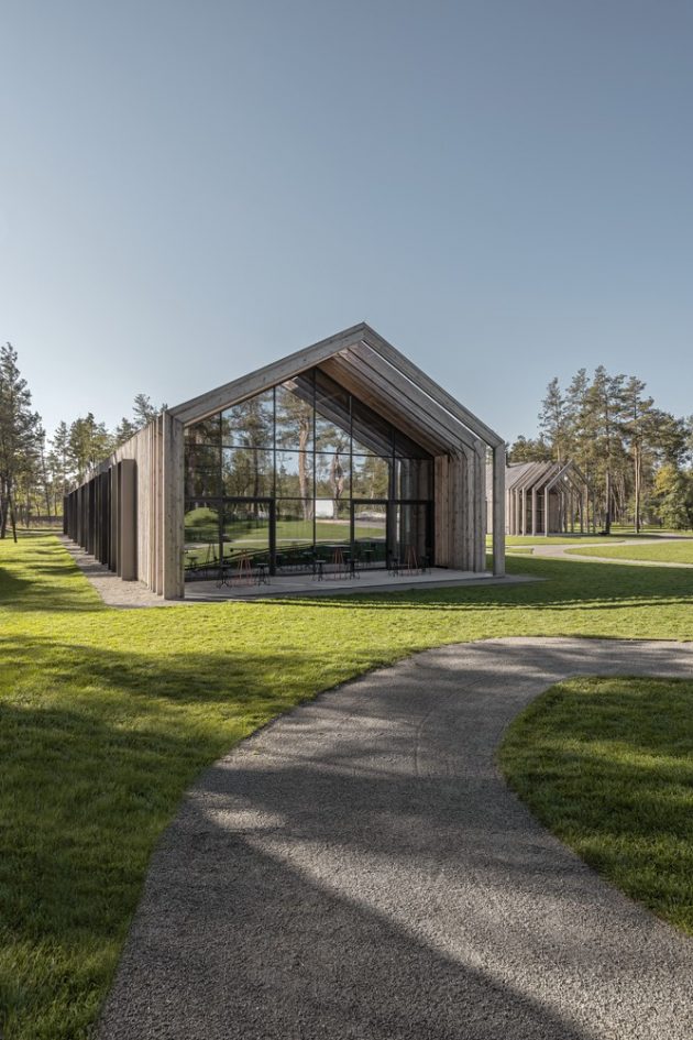 Both buildings made of pine beams look like huge open birdhouses. The main emphasis of environmental friendliness is demonstrated not only in the atmosphere but also in the used materials. Thus, pine of the same species that grows in the forest, that surrounds the recreational complex, was chosen as the main construction material. The architects enchased the outer cladding of the facades with wooden battens and made the interior spaces as open as possible with visible structural trusses to make the buildings look weightless.