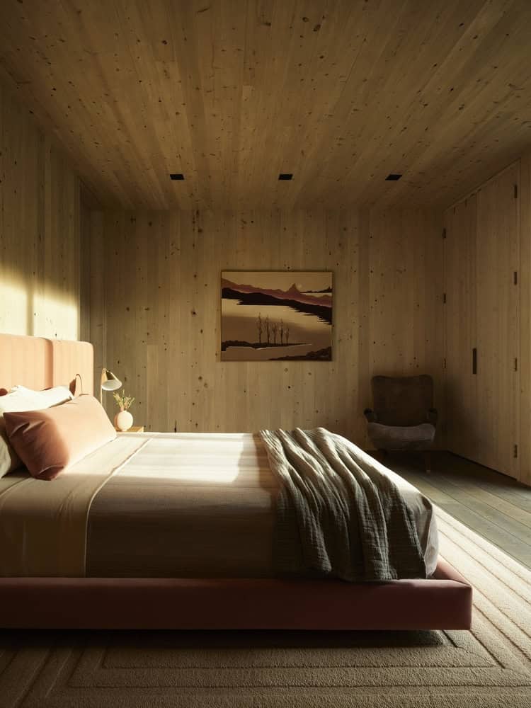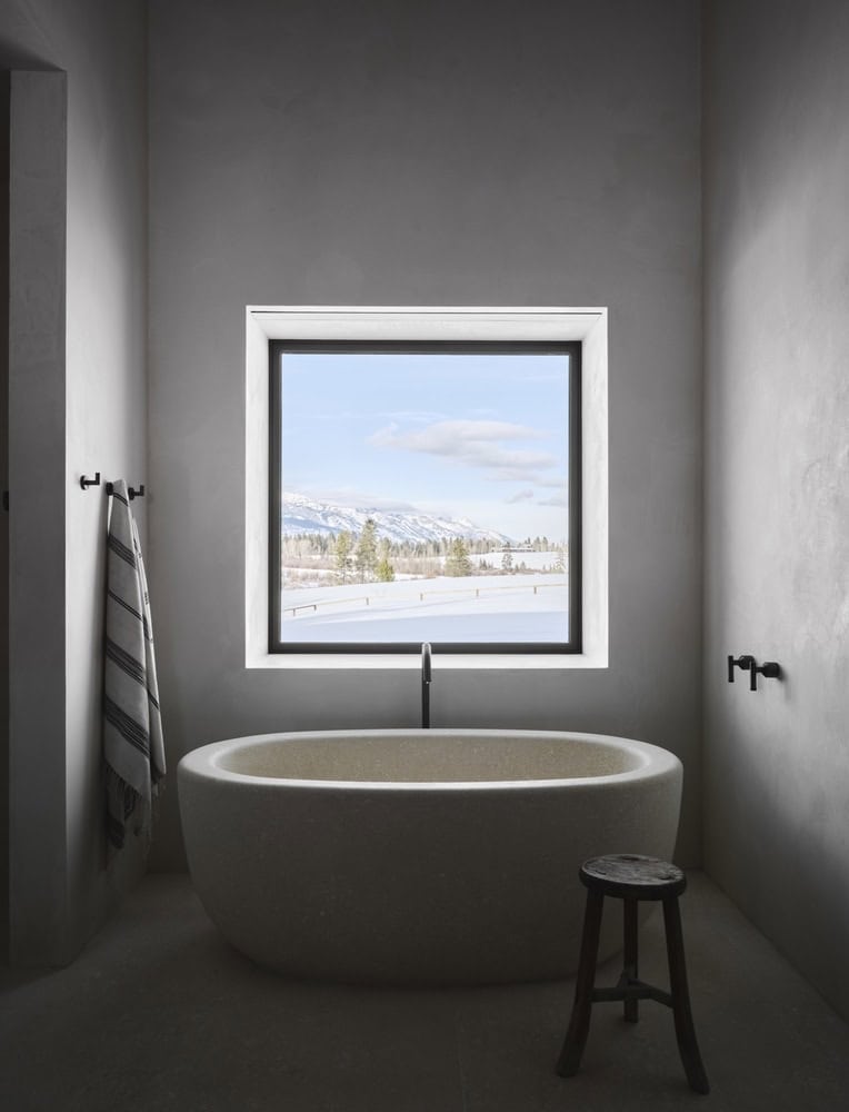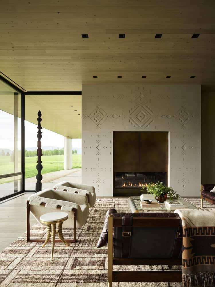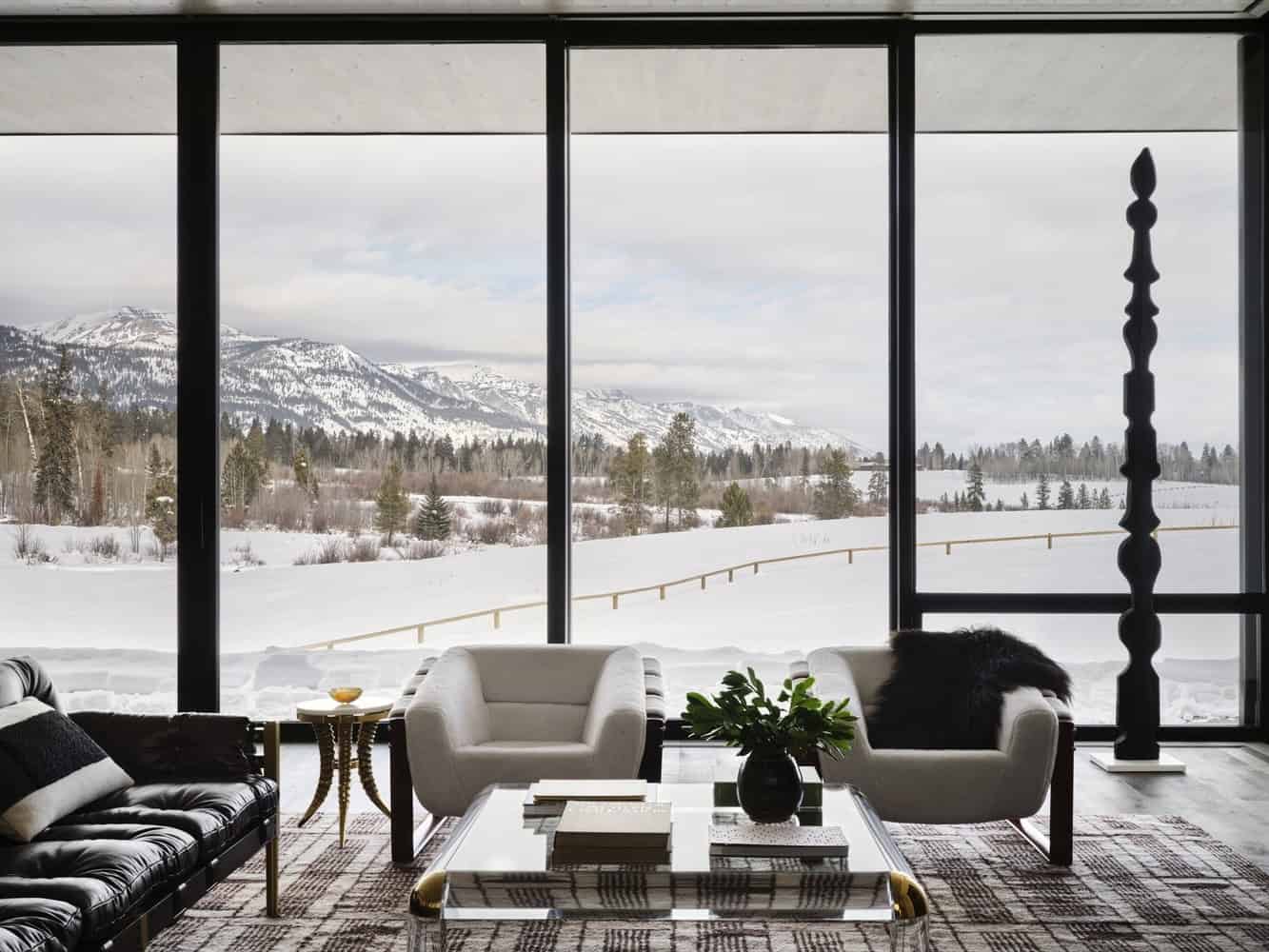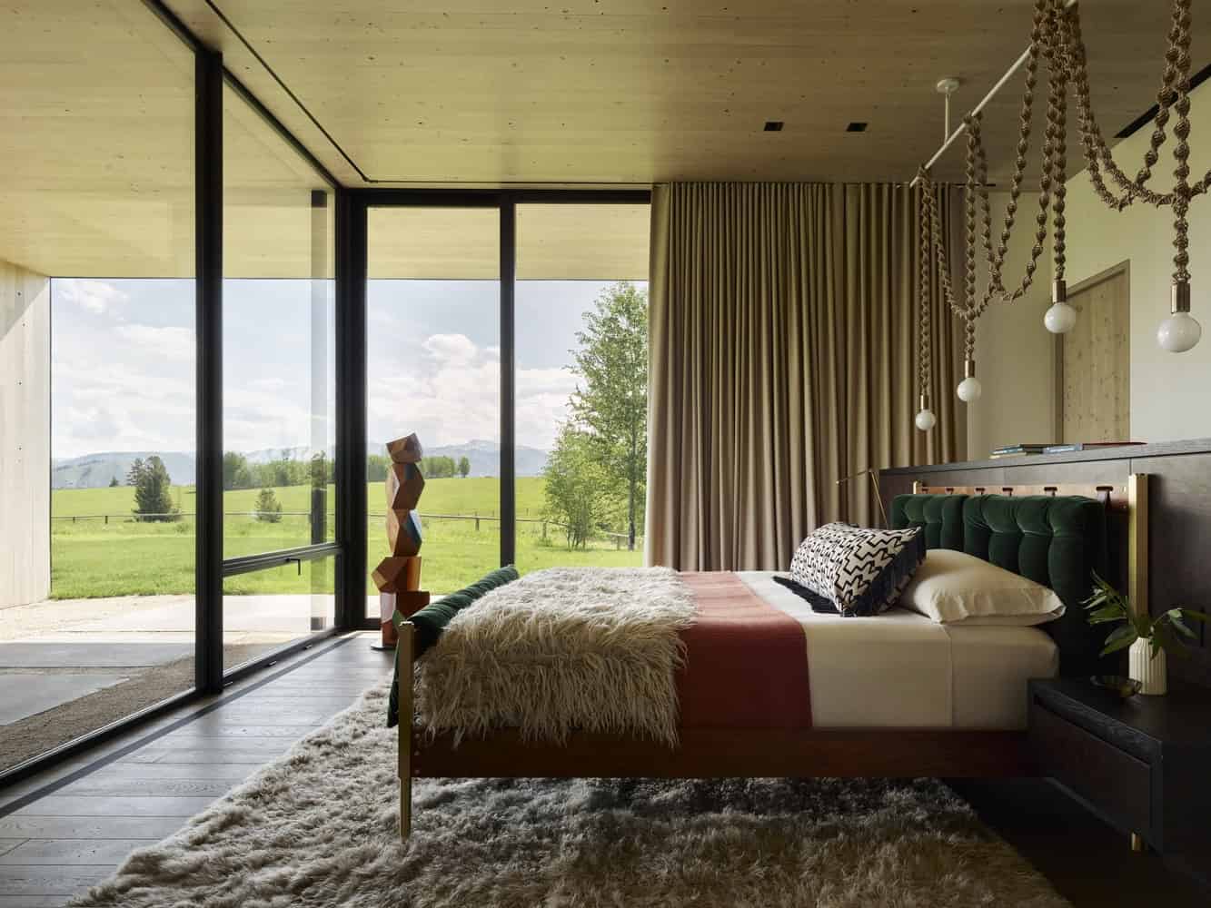 Inside, warm Atlantic cedar, smooth plaster, and floor-to-ceiling glazing create a dialogue between materiality and light. Each opening is strategically positioned to frame prairie vistas and the dramatic Teton range beyond.
