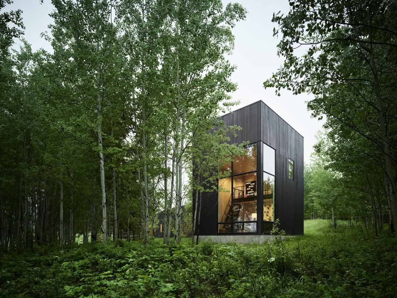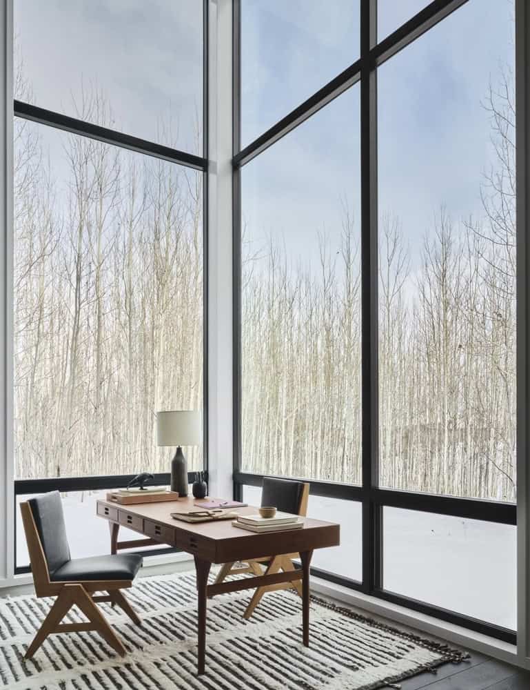 The guest house, with its carved entry and mirrored material palette, offers a tranquil retreat for visiting family and friends. The writer’s studio stands slightly apart—a two-story sentinel among young aspens. With a first-floor living space and a second-floor studio, it immerses the occupant in solitude and contemplation, framing tree canopies and mountain views.