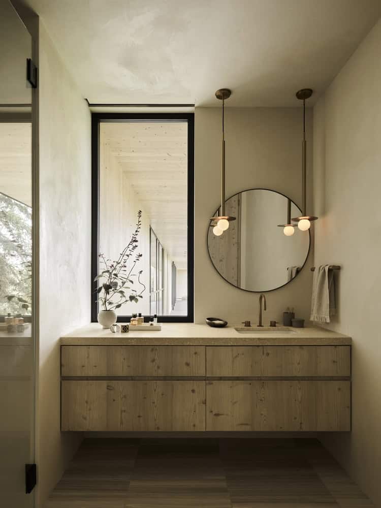 The main residence includes three bedrooms, four bathrooms, a generous mudroom designed for the family’s Irish wolfhounds, and intimate communal zones connected to the outdoors. A sculptural bathtub carved from a single block of limestone underscores the home’s commitment to craftsmanship and material honesty.