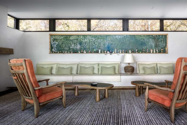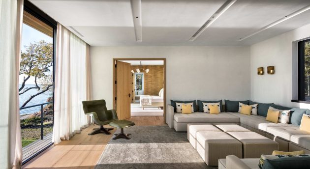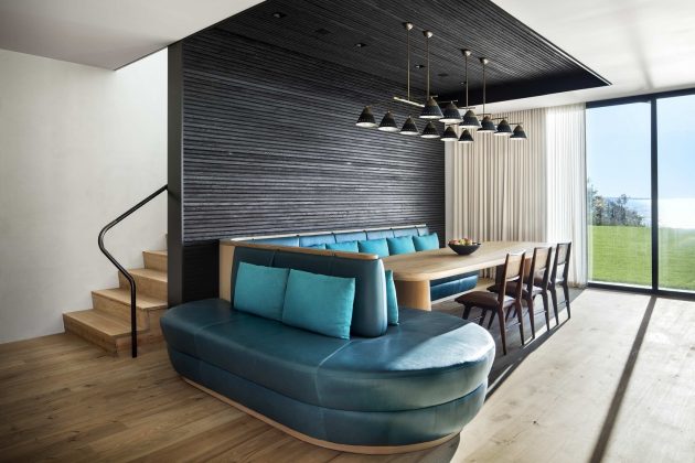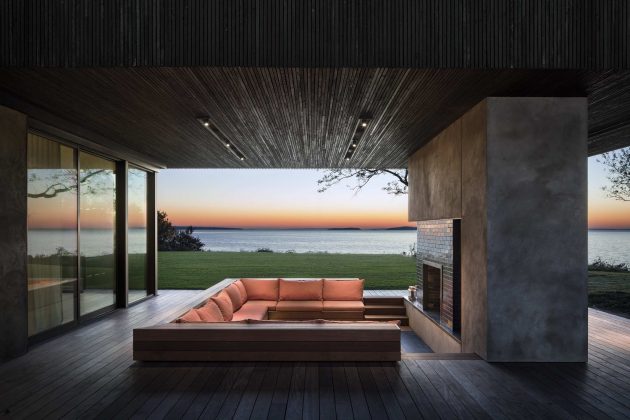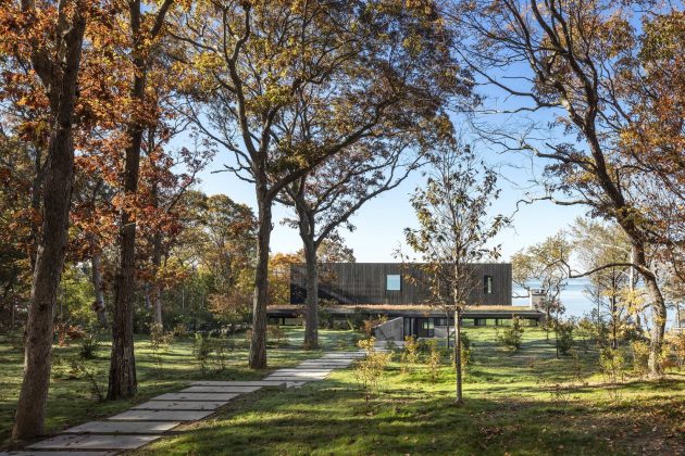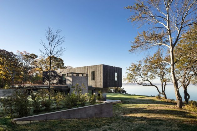 The Shore House is a cedar-clad dwelling in North Haven in Suffolk County, New York designed by the US firm Leroy Street Studio. The main feature of this home’s design is its ability to provide stunning views of the Peconic River. It is built on a sloping site so part of it was excavated to make way for the ground level which is actually embedded into the slope, hidden from view. The second-floor volume is characterized by plenty of small windows that open up views to the waterside.