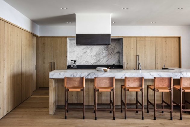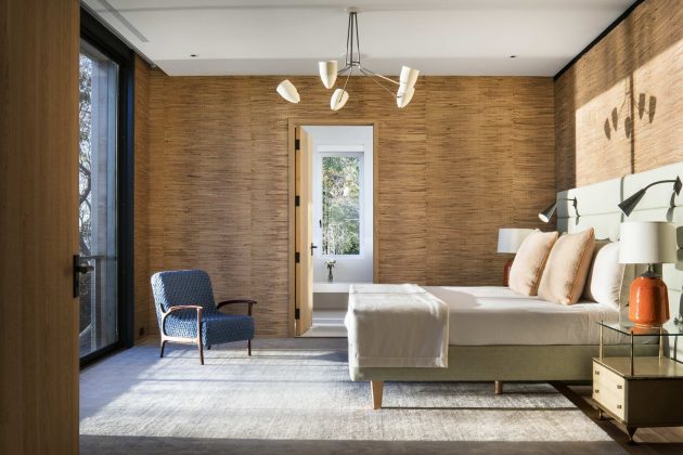 The language of detailing is both expansive and intimate: exploring the junction between abstract modernism and handcrafted materiality. The monumental scale of the cantilevered mass and panoramic glazing are juxtaposed with the intimacy of the texture and warmth of charred cedar, brushed oak, blackened steel, troweled plaster, and hand-glazed tiles.